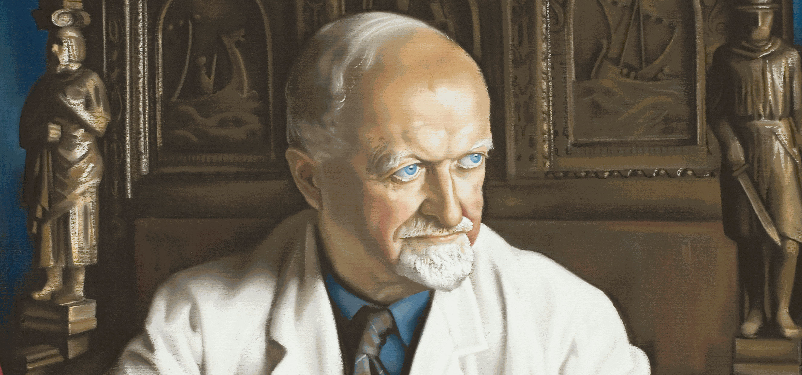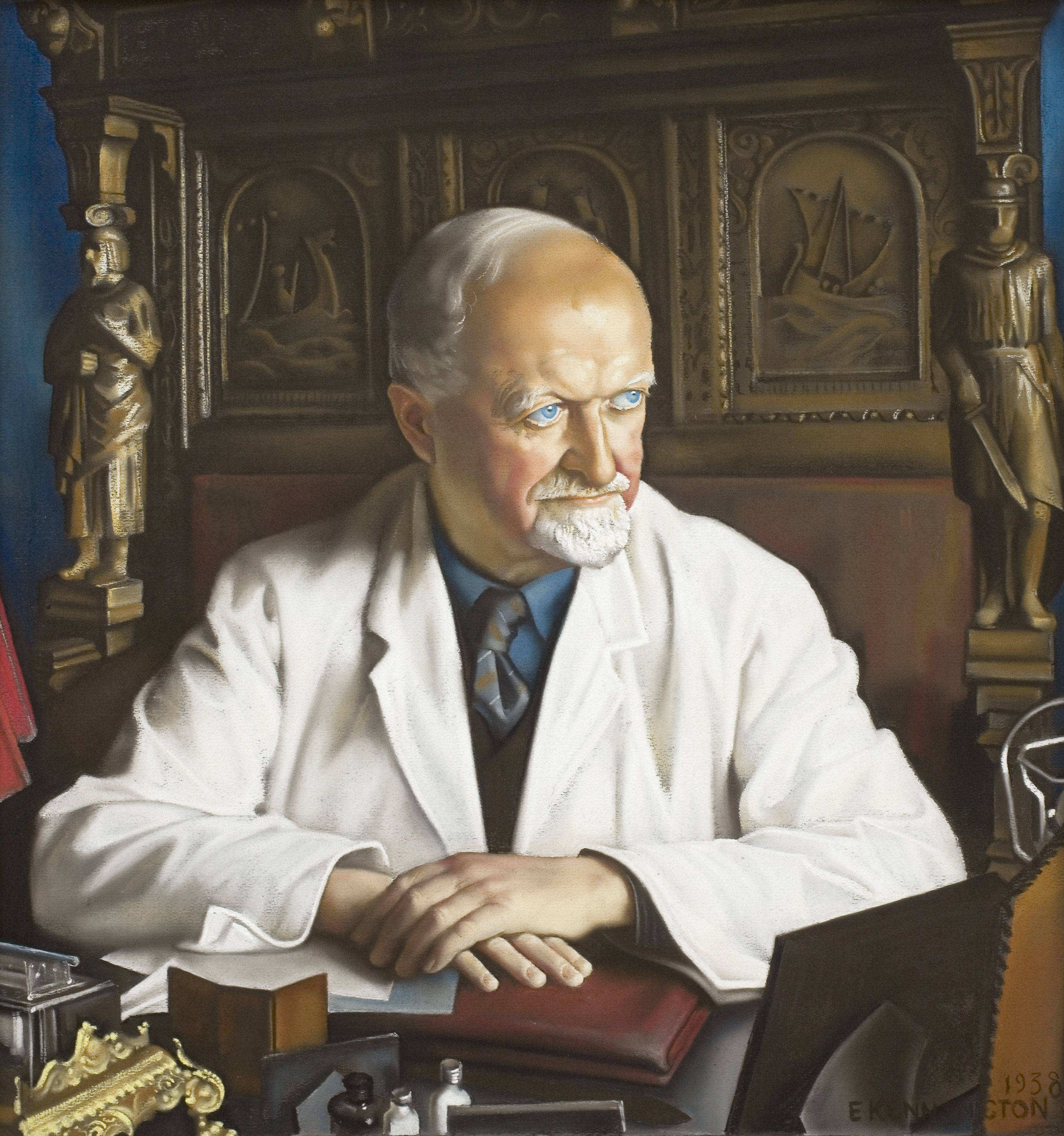 The portrait of Charlie Hansen is executed in a style of vivid, super-realistic figure painting that was current in the 1920s and ‘30s. Using pastels, Kennington depicted Hansen with an overwhelming quantity of visual information: the neat strands of his beard, the crisp individuated folds of his white coat, the precise highlights glinting on the objects on his desk, and so on. Hansen’s skin is luminous, and the shadows in his hands and face are impeccably modelled. All these aspects of the portrait give it a vivid sense of ‘presence’, as if the sitter were actually sitting in front of us. His piercing blue eyes might turn on us at any moment.