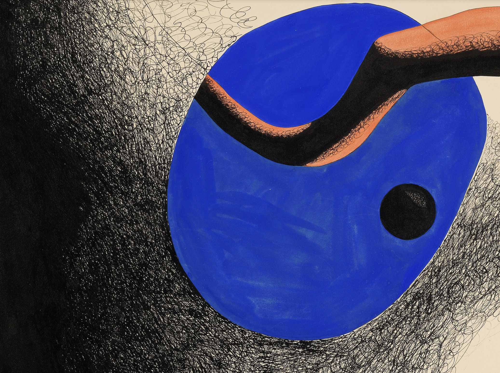 In these works on paper, he adopted the same saturated tone of red and blue which he used in his sculptures. Rather than collapse space into a series of flat planes, as Mondrian did, Calder combined these areas of vivid colour with a cosmic landscape of swirling lines made with pen and ink. These rare experiments made at the frontier of Parisian modernism show Calder’s close connection with continental European art of the 1930s. What is more, as the art historian George Heard Hamilton noted, he was ‘the first American of the twentieth century to win and hold a European reputation.’ It was partly these works on paper which helped him do it.
