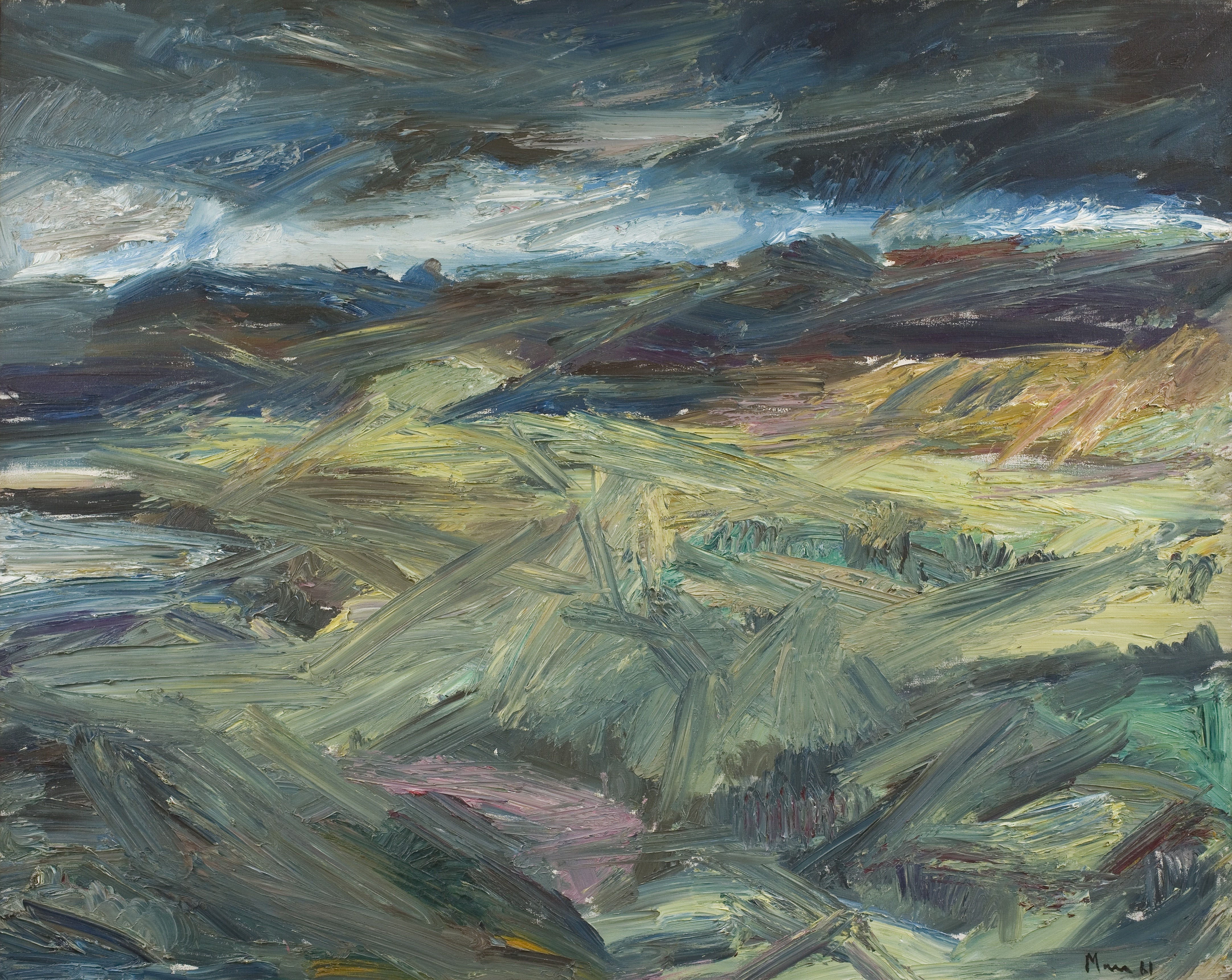 The visit to New Zealand in 1961 was formative and highly successful, and Marr would never again waver from painting as a vocation. For the rest of his life, he has continued to seek out the wilds as a subject for his landscape art. Glen Ceitlin is near Loch Etive and curves round the base of Stob Dubh in the Grampians. In a work of 1976, Marr portrayed the glen and its looming neighbours from what appears to be the lowest possible perspective, emphasising the precipitous height of the mountains and registering the lowering sky with a palette of bruised pinks and muted saffron. This Highland landscape painting has a structural clarity and thick impasto redolent of Bomberg. However, despite its formal connection to the style of his teacher, this painting was not inspired by other works of art, but rather by the sublime wilderness of the landscape itself.