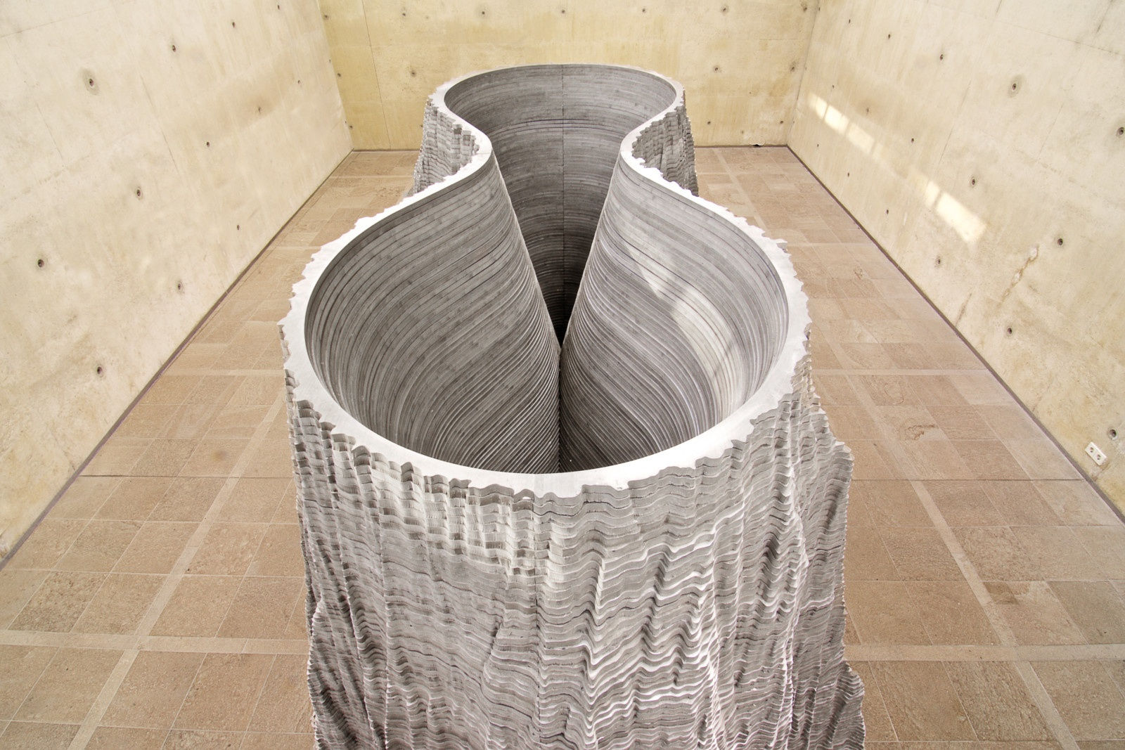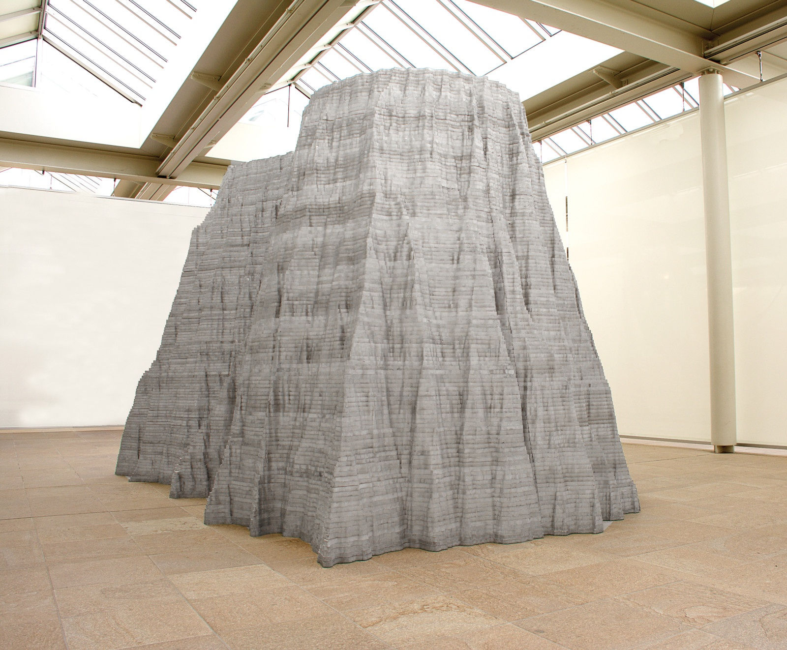 The spiritual connotations of Mountain are further magnified by the near-miraculous process of manufacture by which it was created. Like many of the most successful contemporary artists, from Bridget Riley and David Hockney to Damien Hirst and Antony Gormley, Kapoor relies on the assistance and technical expertise of a large studio. Many of his works, including this one, are fabricated by Adam Lowe's Madrid-based workshop, Factum Arte. Though all decisions of aesthetic importance are taken by the artist, a work like Mountain could not be realised without specialist expertise and engineering precision. The work is composed from 120 layers of aluminium, each measuring two centimetres in depth. They are stacked up one on top of the other and taper inwards as the structure grows taller; each piece relates to those above and below it, while maintaining an outline which is subtly different from the shape of its neighbours. Made at a time when computer aided design was undergoing rapid development, Mountain’s composite parts were cut using a water jet cutter – a refined tool capable of realising the complex silhouettes of Kapoor’s design. Each layer of aluminium in the work has a unique profile which could only be cut with such precision by a machine.
