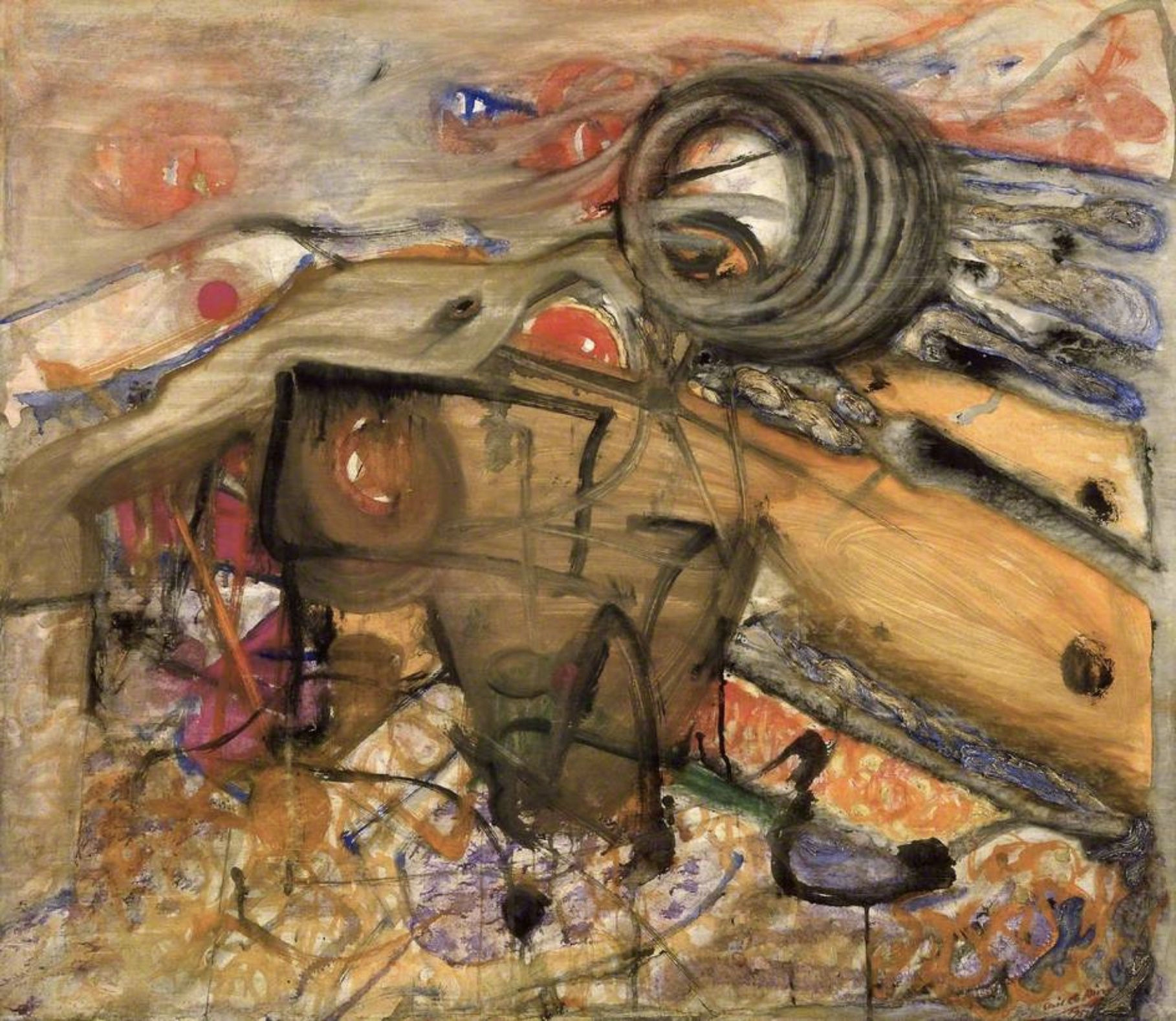 In the late 1950s, Collins resolved to make a change in his work. He discarded his previous manner of exacting outlines and figural representation, turning instead to a far more abstract style underpinned by improvisation. Executed in 1961, The Waters of the Sun is one of his ‘matricular’ paintings from the period. The series was based on pure imagination and was intended to provide a visual doorway into ‘the matrix’ – the conditions that are formative to life itself. Judith Collins (no relation) curated a retrospective exhibition of the artist’s work at the Tate Gallery in 1989 and explained the thinking behind these works.