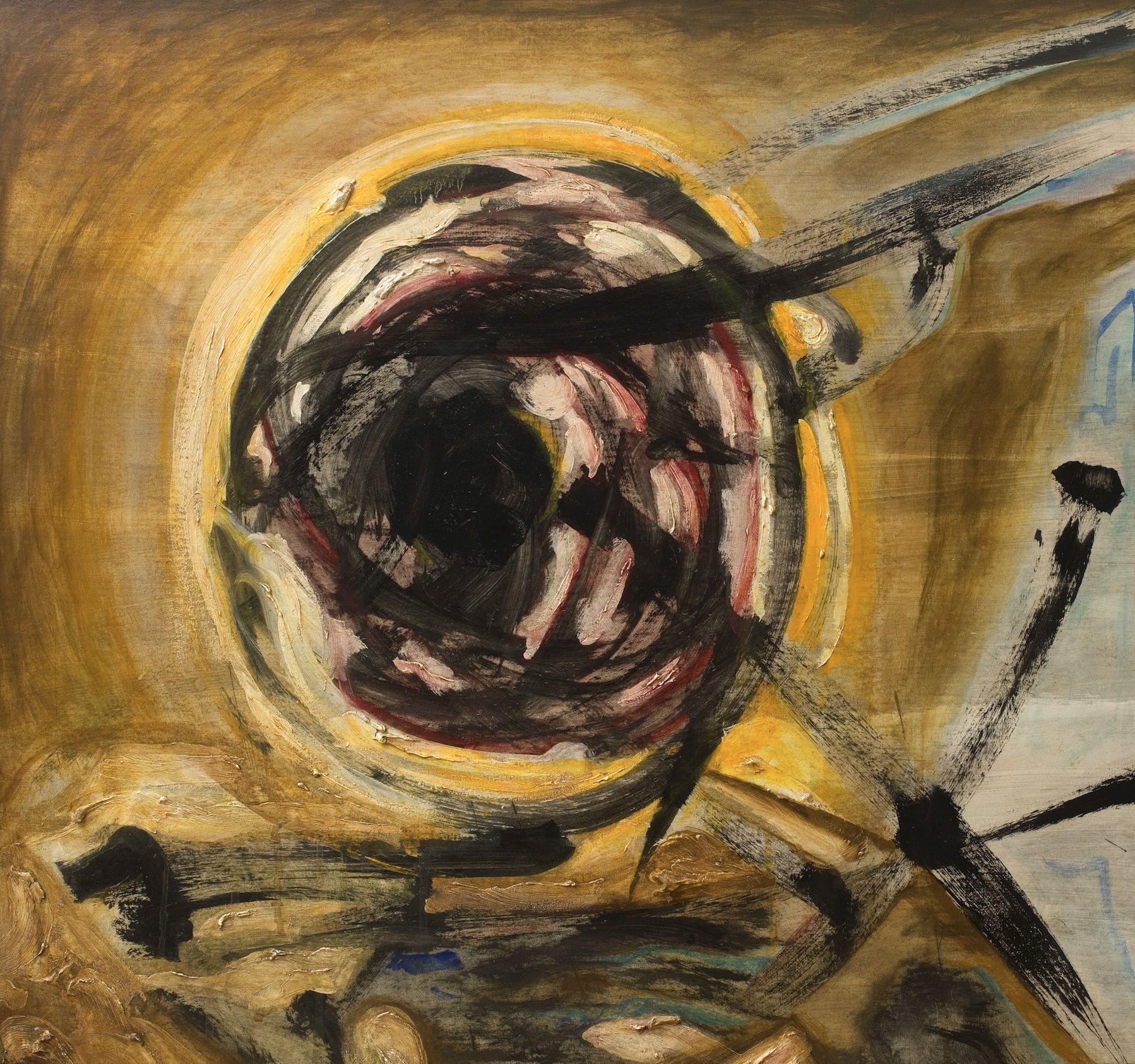 [These matricular works] consisted of beginning with a loaded brush with a different colour in each hand, the eyes shut, and a gestural attack with the pigment on to the support. With the opening of the eyes, an image or idea emerged from the working of the paint. A fluid and creative collaboration between materials and manipulator ensued… The ‘matricular’ procedure was for Collins equivalent to the execution of a rite and it also performed for him a rite of passage.
