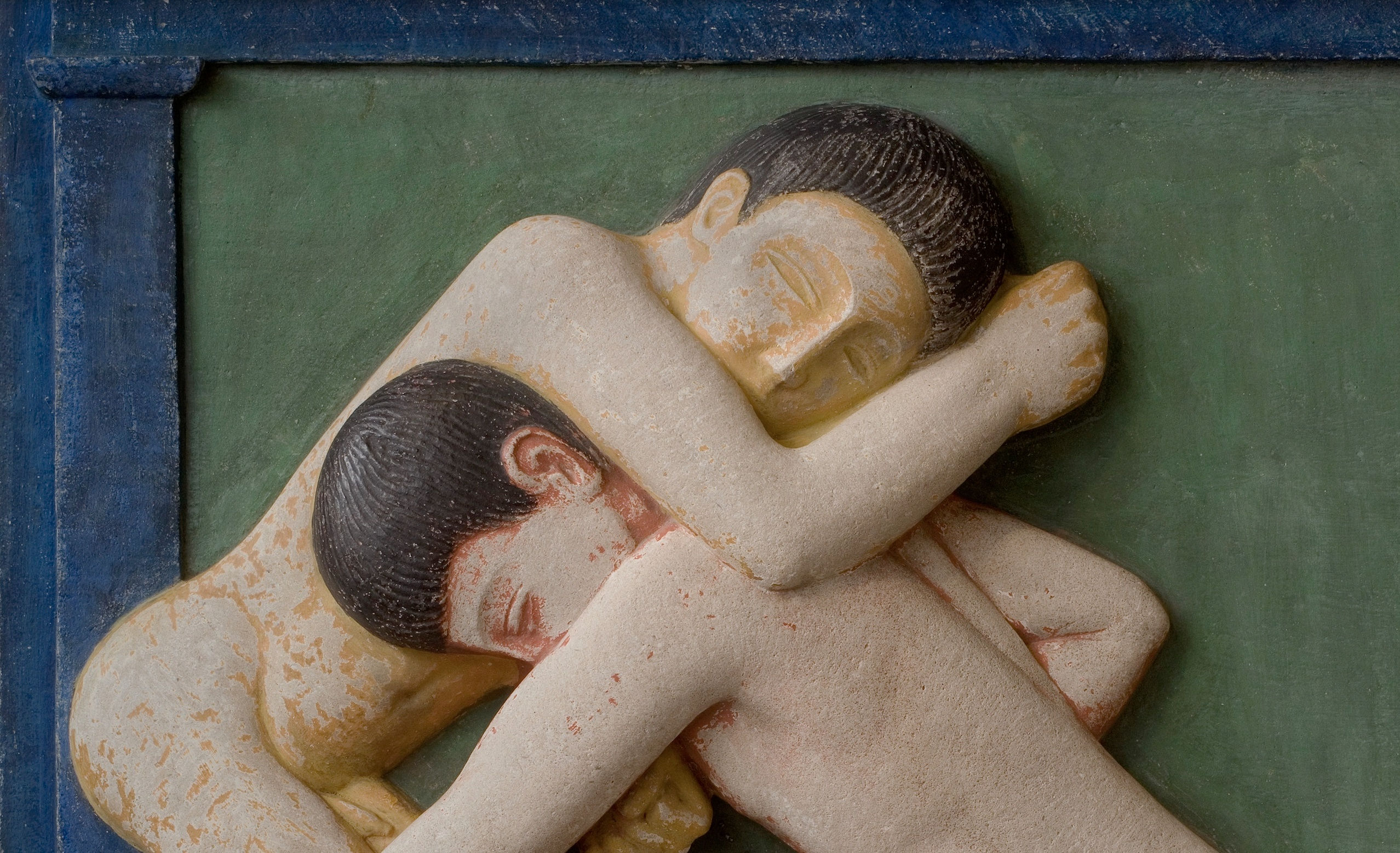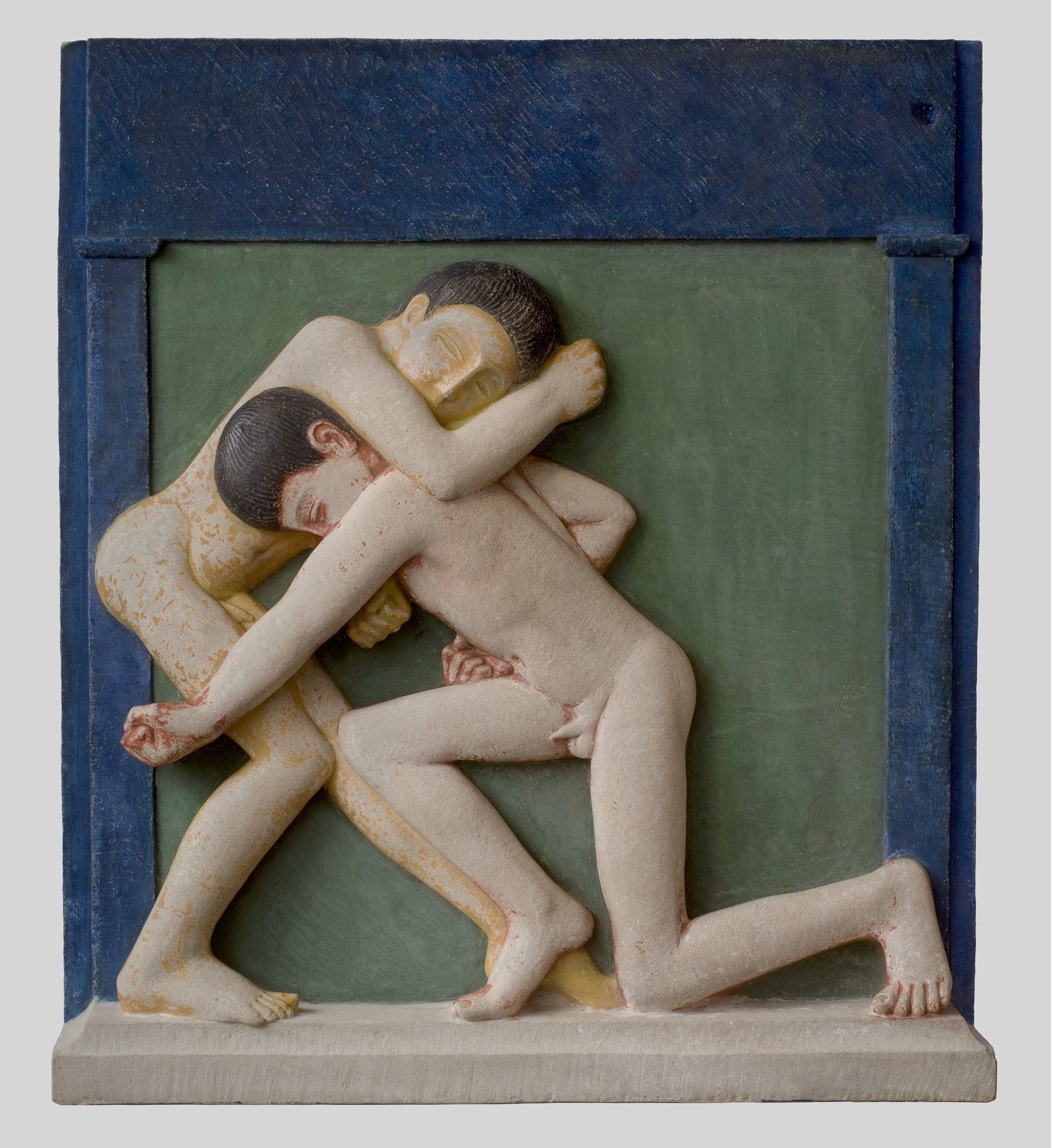 A further salient connection between Boxers and The Dance is the colouring of the figures’ skin. Where Matisse depicted the dancers in a uniform red hue, Gill’s two figures were at one time coloured in brilliant, unmodulated hues of red and yellow. (After exhibiting the work at the Goupil Gallery in January 1914, he added colour to the figures in February or March that year, but subsequently removed this, while leaving untouched the figures' black hair and the green and blue architectural surround.) In these significant works of modernist primitivism, colour held a semantic value, helping to signal the avant garde ‘otherness’ of this art. Alongside these values, however, Boxers also follows certain Western traditions. The sculptural block as a whole is modelled as a metope, a type of relief carving which originally adorned the friezes of Greek temples. This connotation is only underlined by a simple classicising framework of plain pilasters to mark the left and right edges.