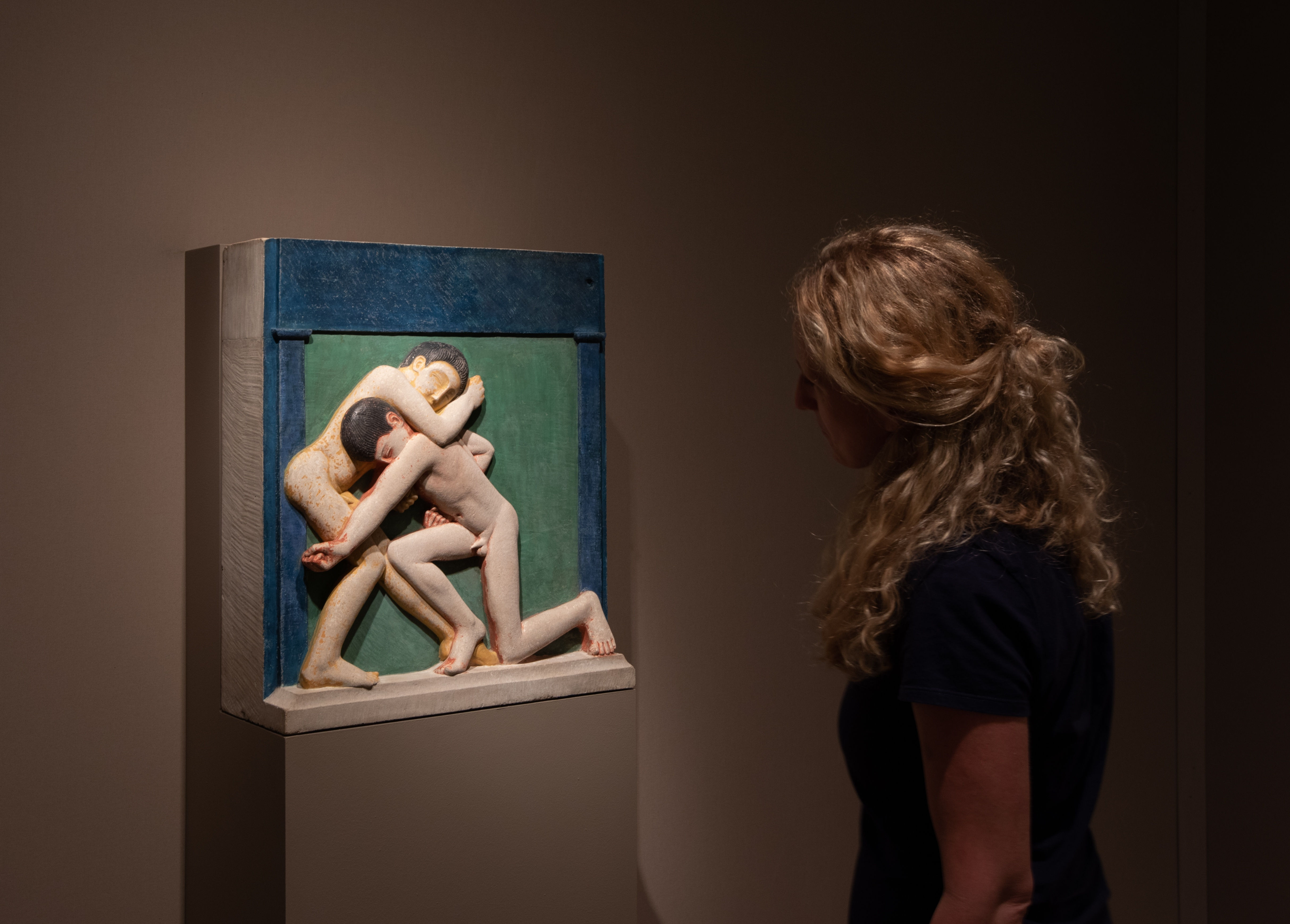Boxers was initially commissioned from Gill by Count Harry Kessler, an Anglo-German man of culture and a patron of modern art. He never took possession of the work, however, and it remained in Gill’s studio until 1915. At that time, it was purchased from the artist by another of his patron friends, Geoffrey Keynes. Keynes made a number of visits to see Gill at Ditchling in 1912 and 1913, on one occasion visiting with the poet Rupert Brooke and later commissioning a Mother and Child subject from him. Gill addressed his letters to ‘my dear Keynes’ and borrowed Keynes’s Mother and Child carving for an exhibition at Goupil Gallery in 1914 – the very place where Keynes first saw Boxers.