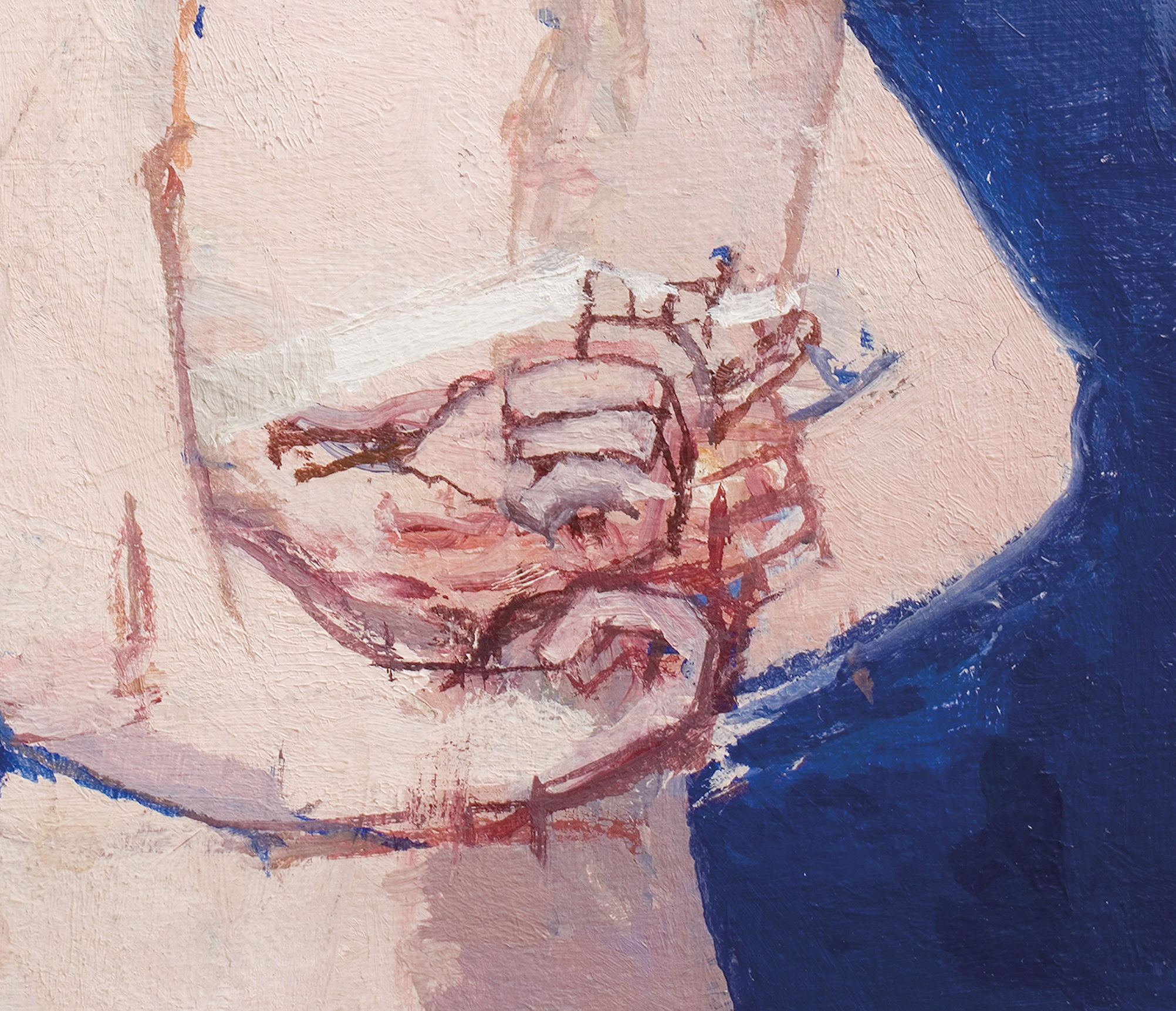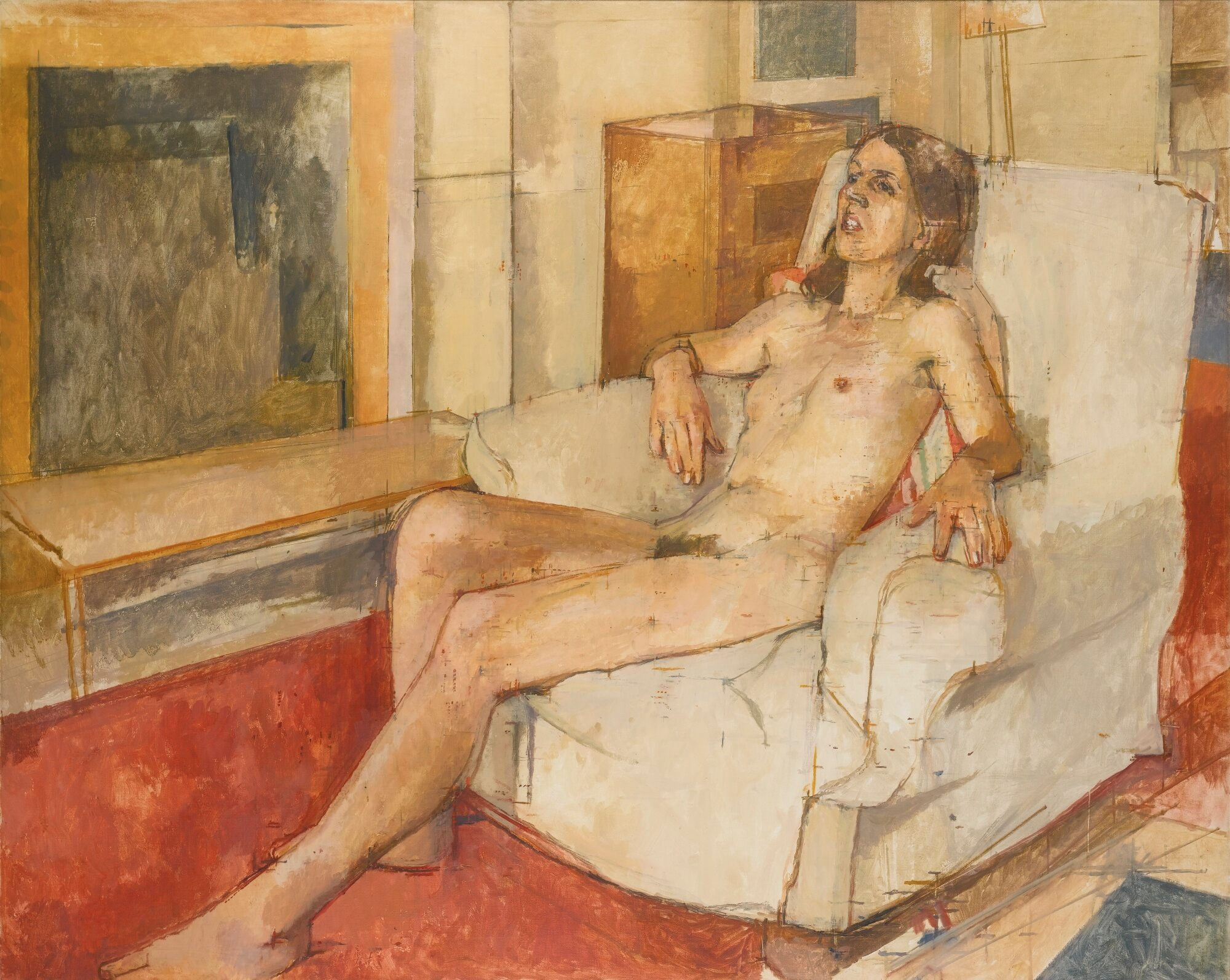 Partly as a result of his time in the art school life room, female nudity was a leitmotif throughout Uglow’s career. Though Cherie Blair is known to have modelled for him in the nude when she was studying law in the 1970s, many of his sitters remain anonymous, as is the case with the woman in Night Scene. Unusually for Uglow, this work was painted from memory. At the centre of the picture are the woman’s clustered hand movements, unfastening her bra – a gesture which the artist enjoyed not just for its sex appeal but also for its pleasing pictorial awkwardness. Speaking to Martin Gold in March 1989, a few years before this work was painted, Uglow said he had once seen someone put a jumper on over her bra in public, just off the Fulham Road. It was apparently ‘one of the sexiest things’ he ever saw.