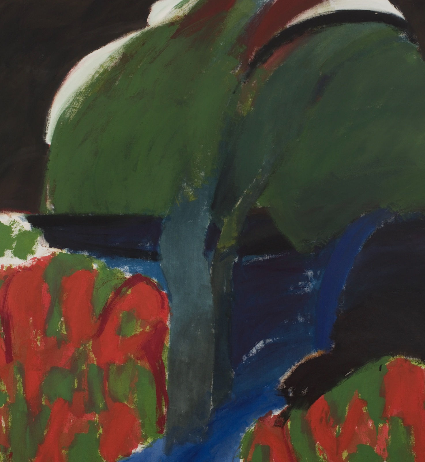 Crozier’s landscape art was perennially inspired by an obsession for particular places. His series Swift’s Lake, for example, made in 1977 and ‘78, was inspired by the water meadows which lie immediately to the north of Winchester School of Art. Around that time, he explained to his fellow artist Ian Kirkwood that the mark of success in a landscape painting was sometimes that one had ‘extracted the very essence of the thing that is there [in a place]’. It would be unusual if Black Lake was not based on a specific place, and there is an elementary topography to the painting’s composition which suggests a certain land, possibly the same watery site in Winchester: a camouflage foreground of red and green, the unmanaged lakeside growth perfect for Elephant Hawk-moths; the ink-like waters of the lake, snaking flatly through the middle of the picture; and the suggestion of a horizon, partially concealed by a verdant cloud-like canopy which bears only a casual relationship to the tree trunk positioned at centre-left.