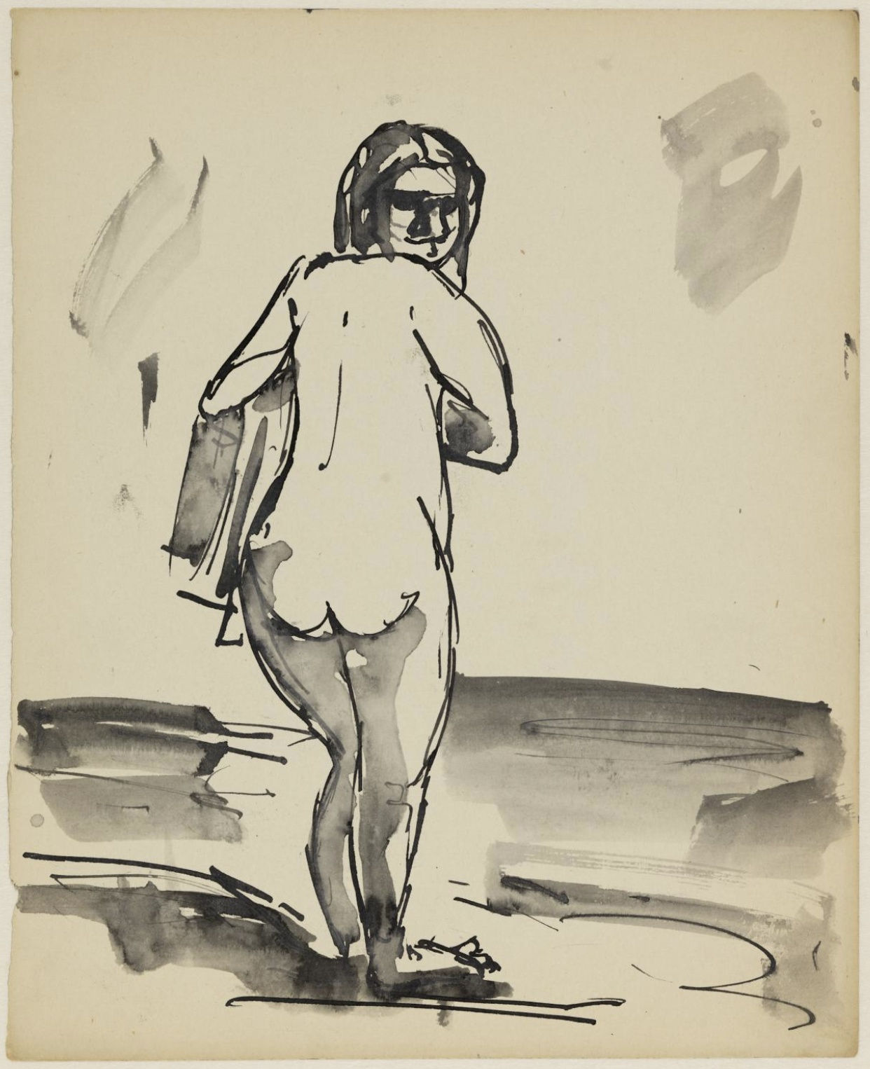 His interest in the female nude began to develop from 1950. There are five ink wash drawings of female nudes by Herman from the early 1950s in the Tate Gallery Archive, donated by the artist in 1983. One of these works is explicitly a study of a woman standing beside the sea along the Gower Coast, an hour’s drive from the artist’s home in Ystradgynlais, and it is likely that the figures in Women on the Shore were also studied from life in Gower. The identity of the women in these wash drawings is difficult to place though it appears that Herman reused figures from the studies. It is possible that Women on the Shore depicts the same woman standing in two different attitudes.