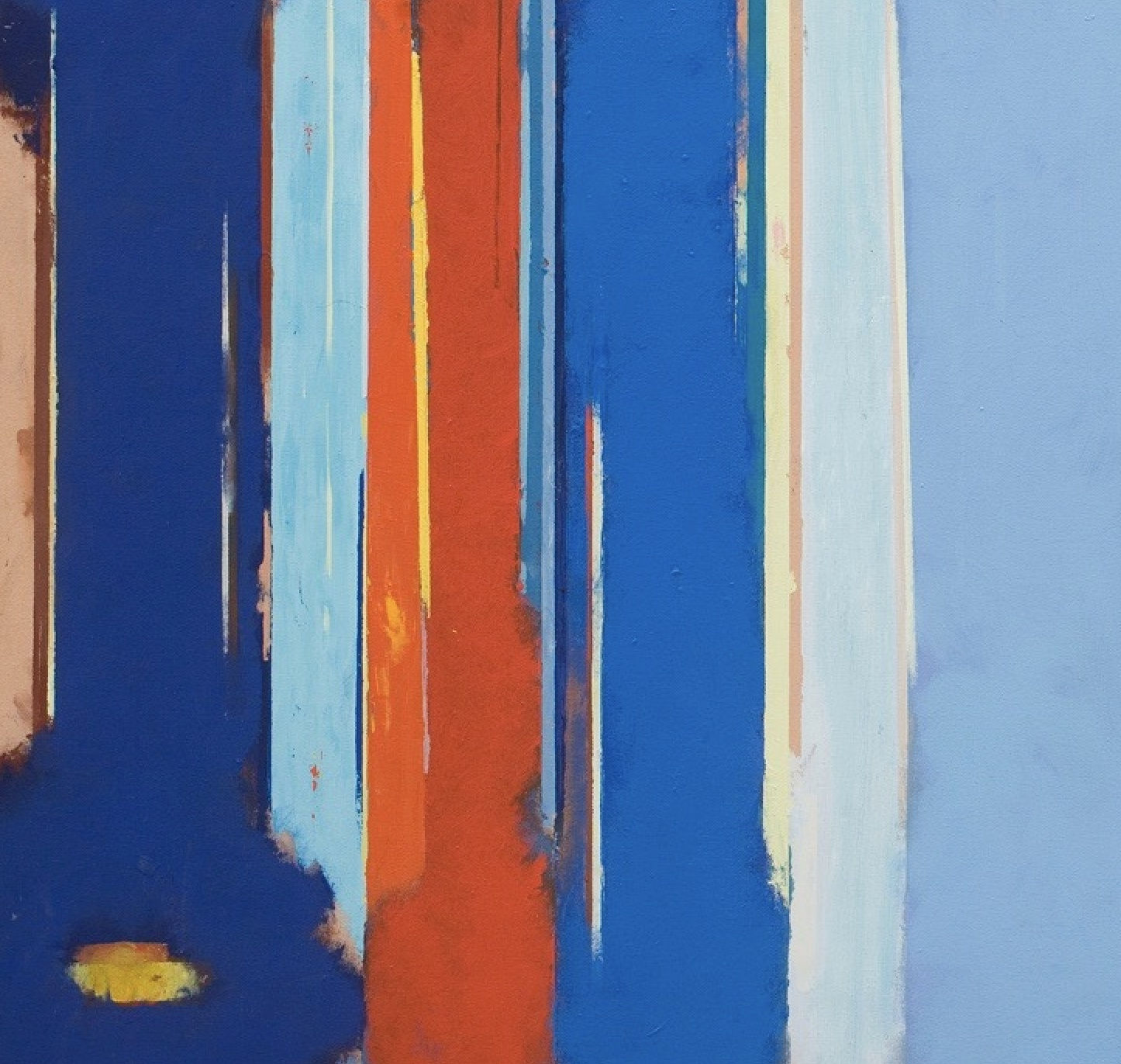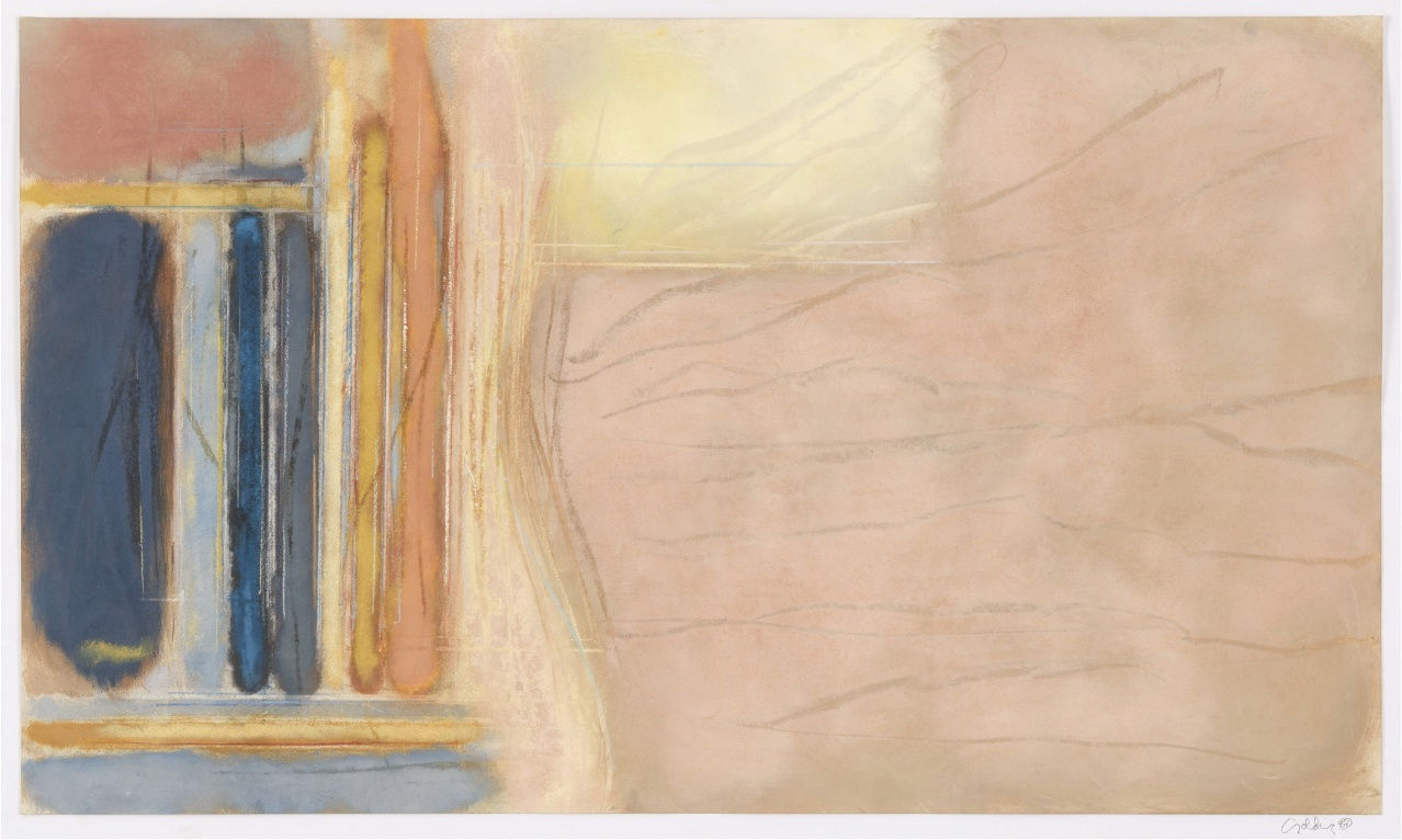 Golding's preparatory process offers an insight into such richly colourful, large-scale works. He created many delicate pastels which explore combinations and spatial arrangements of colour. In these works, some of which were filled on both sides, the paper was saturated with sensitively contrasted and intermingled channels of ochre, sky blue and sand yellow. Light was the subject of his investigations and Golding drew unfailing inspiration from the challenge of suggesting it in his work. The fluency of pastels like Drawing 80/10 was neither glib nor facile, originating as it did from an underlying process and the overarching ambition to explore effects of light – the way it transforms colour, dissolves substance, assumes its own physical presence, and so on.