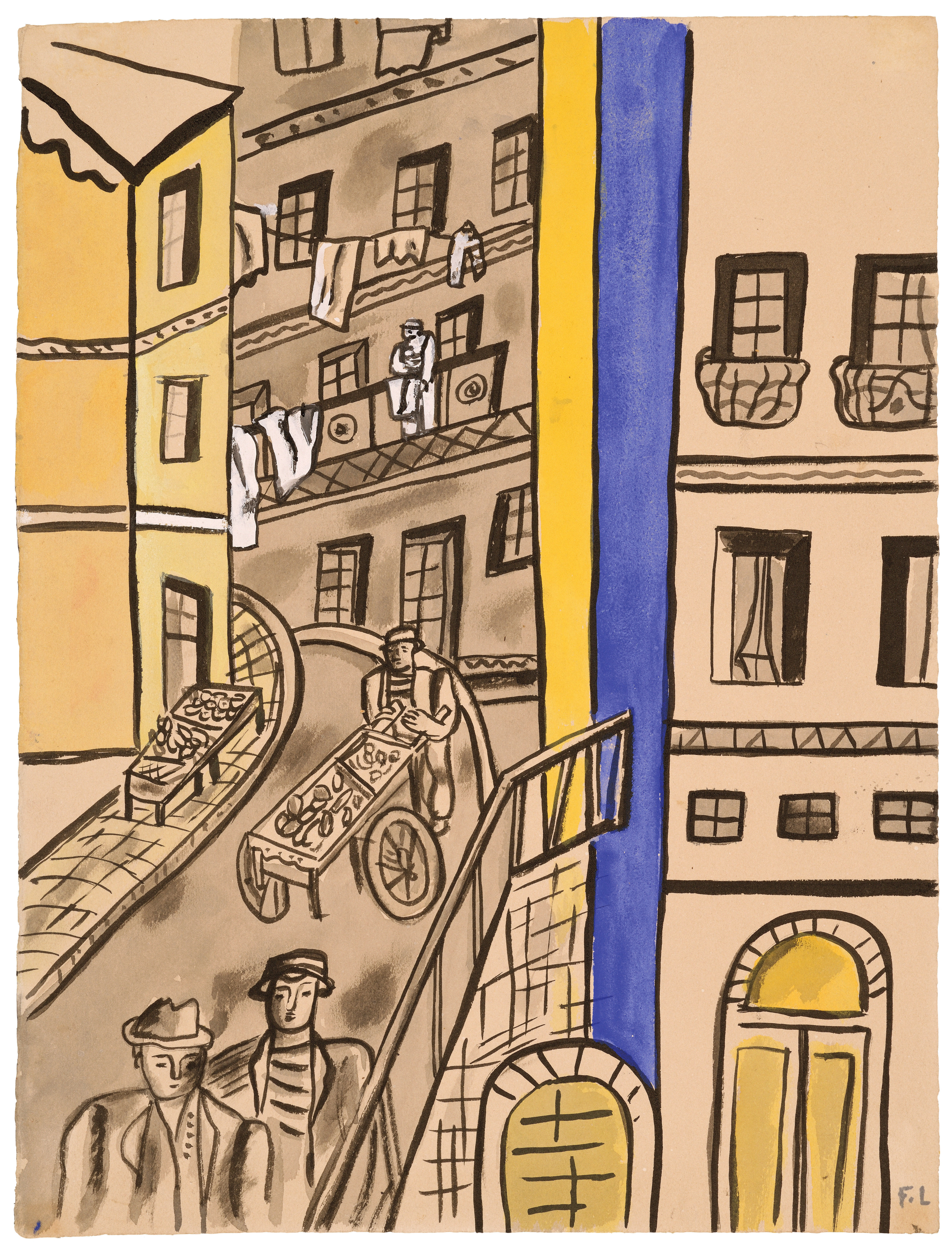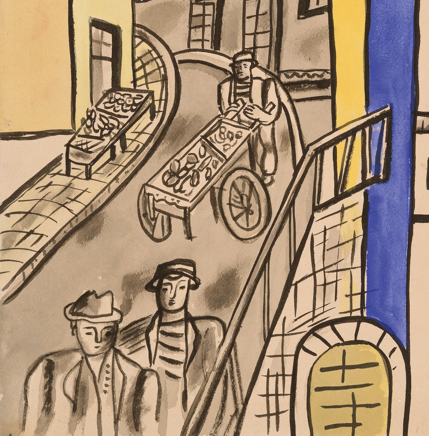 It is an enduring cliché of European modernism that stylistic progress is driven forward by ingeniously talented individuals, and it is artists like Léger which have sustained it. Considerable attention has been given in recent years to his success as a polymath, producing murals, book illustration, ceramics and film. However, his success in these media derived from his talent for making paintings and watercolours: ingenious works of art which interlock their subject with terse formal devices. It is works like La Rue which exemplify the meeting of these two halves, encapsulating Léger’s joyful exploration of composition and colour, the human body and complex human society.