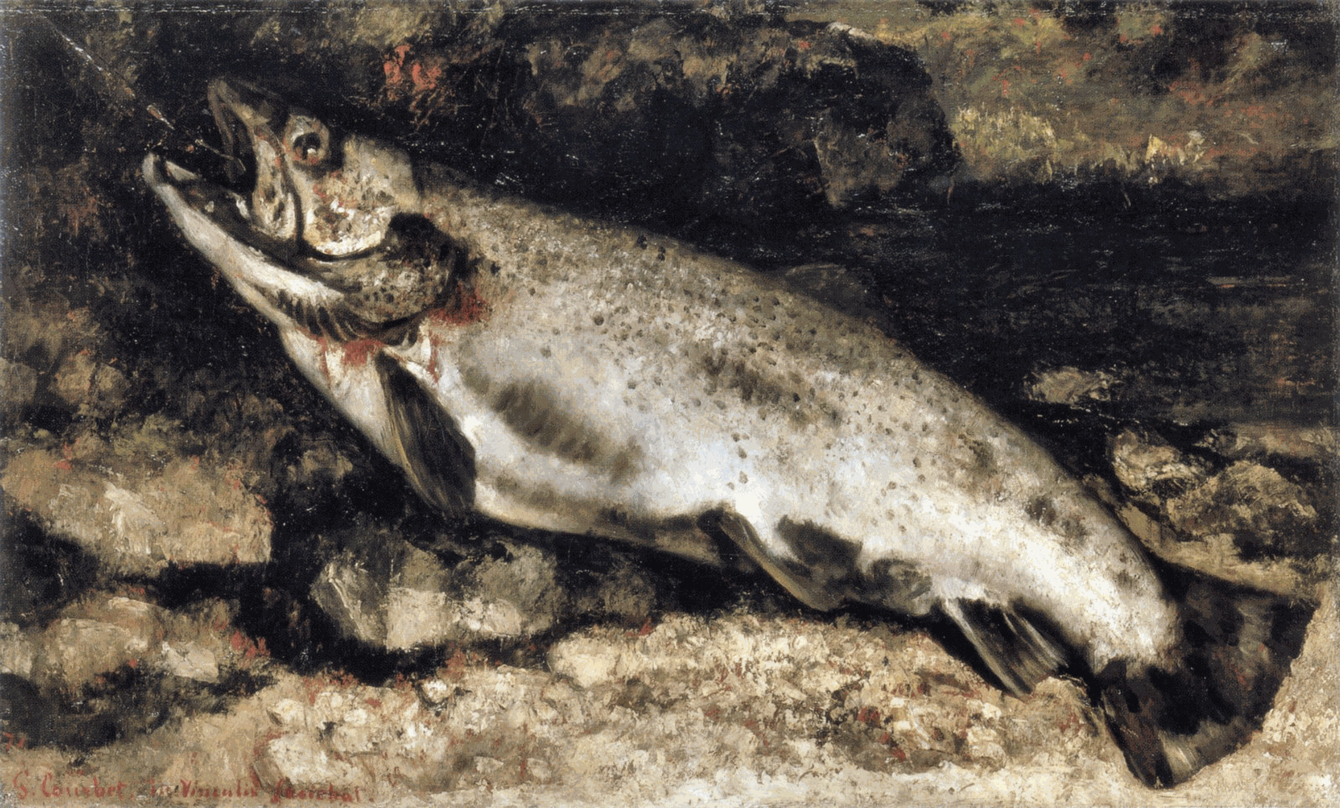 Writing in The Journal of the Royal Society of Arts from May 1956, the critic Neville Wallis noted the inclusion of Coker’s ‘butcher’s carcasses’ at the Royal Academy Summer Exhibition. He suggested that the paintings were ‘that dour, relentless mode introduced soon after the last war by the French realists’. Wallis was perhaps thinking about the paintings of Balthus or even Francis Gruber. Though French in origin, Coker’s personal creed of realism in fact grew from his awareness of Gustave Courbet, the nineteenth-century originator of ‘realism’. Coker first saw his work in person on a visit to Paris in 1949. The spirit of a painting like Fish with Grill derives from Courbet’s own paintings of fish, and the French artist was to be a point of continuing reference for Coker throughout his long career.