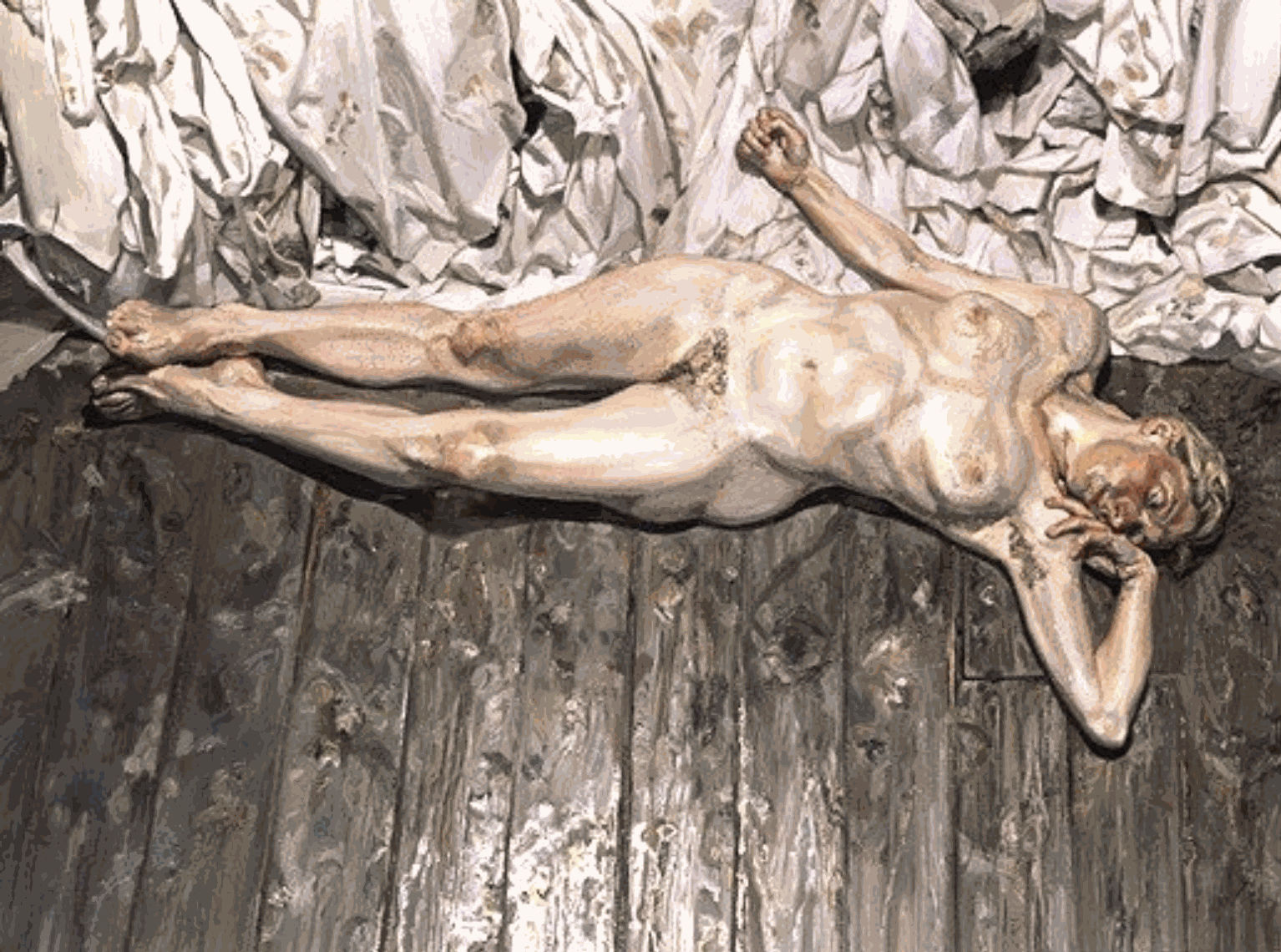 In Fish with Grill and several other ‘meatscape’ still lifes by Coker, the wooden planks of the table run continuously through the length of the picture, from top to bottom or side to side. A perennial source of interest to painters of a realist sensibility, bare floorboards have occasionally been made a painting’s chief subject – as they were in Gustave Caillebotte’s Floor Scrapers (1875), for example. Continuous flat pieces of open-grained wood are a rich source of visual interest, variously reflecting or absorbing the light and displaying a more or less irregular pattern of knots. Following Coker’s intense scrutiny of the table’s wooden boards, another post-war realist painter adopted this as a technique for activating negative space. Floorboards were prominent in Lucian Freud’s work from the late 1960s onwards, each one fastidiously observed and delivering on his claim to paint a ‘ground’ rather than merely a ‘background’.