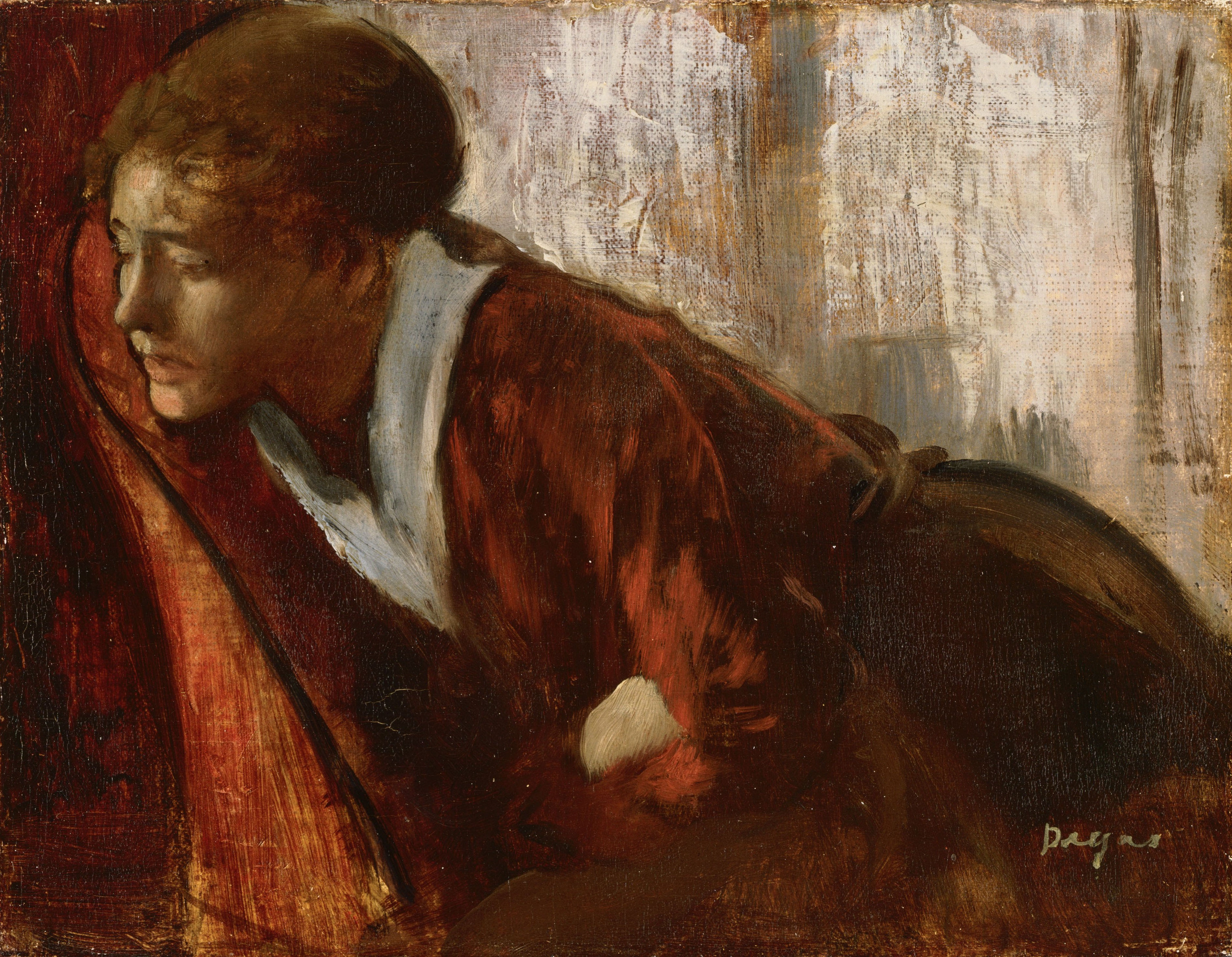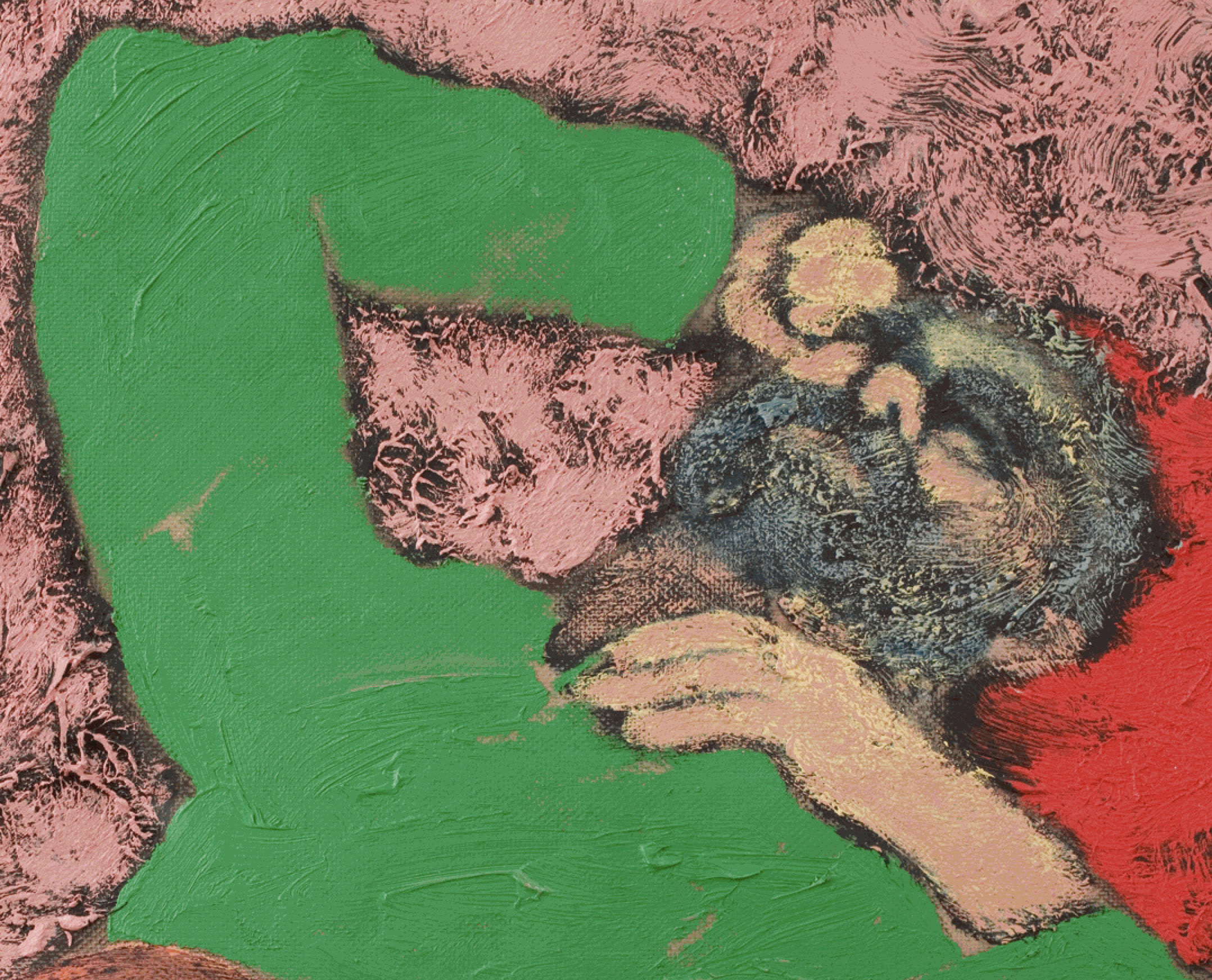 One of Kitaj’s fascinations was the painting of late nineteenth-century France. He once suggested that his focus as an artist was ‘not only to do Cézanne and Degas over again after Surrealism, but after Auschwitz, after the Gulag.’ Fed Up, Again shows Kitaj acting on his statement. The smoothly brushed impasto of the vermilion trousers relates closely to the painterly, wet-in-wet surface of Degas’s own version of Melancholy. The sitter’s state of troubled repose and the stark contrast of pink and green in Fed Up, Again delivers the undertow of surrealism which Kitaj promised in his declaration.