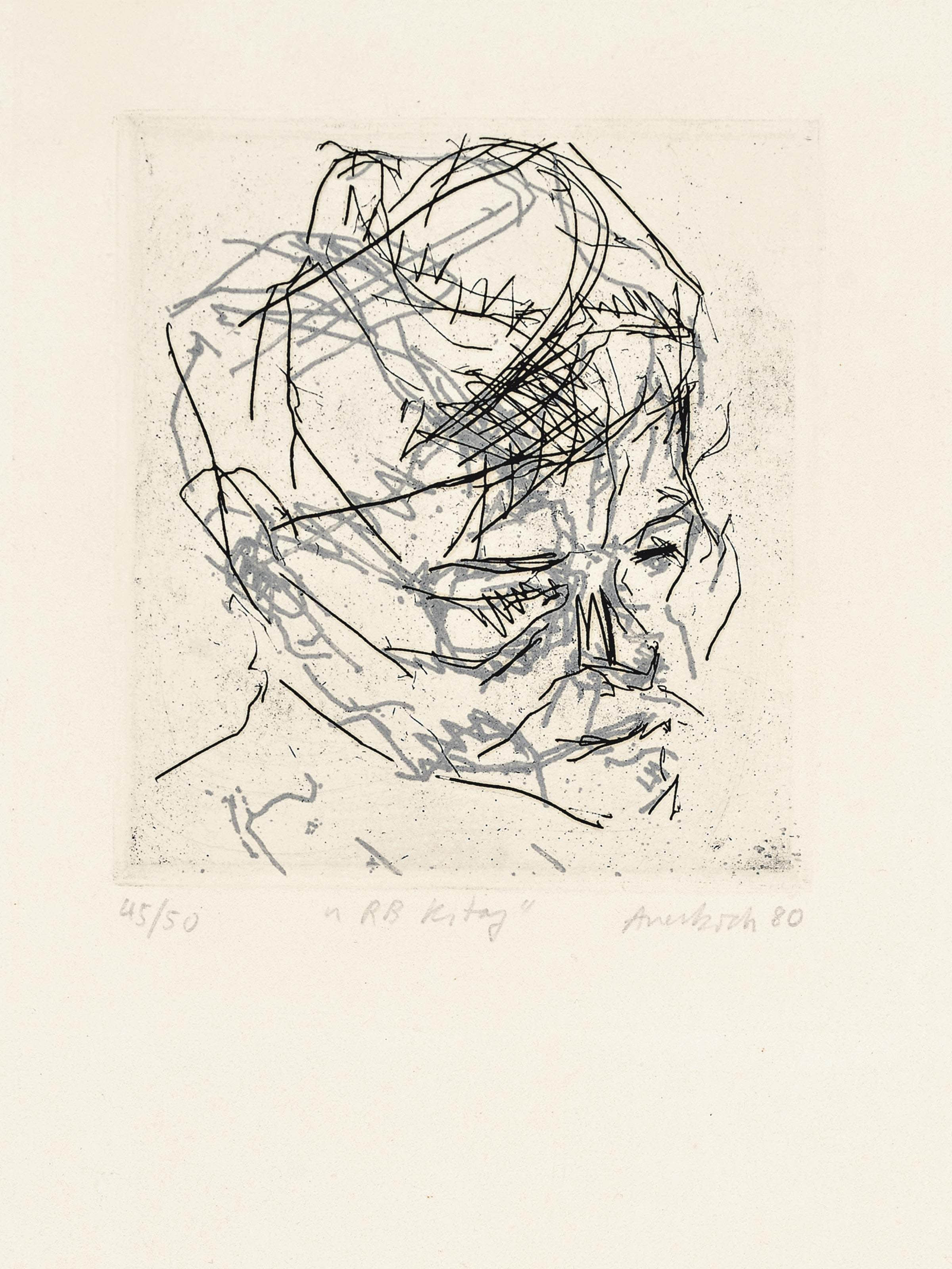 In turn, Auerbach’s series of portrait etchings from 1980 – Six Etchings of Heads – helped to cement the notion of a select group of London-based figure painters. The series depicted three of the artists included in The Human Clay, namely Freud, Kitaj and Kossoff. Dating from one year after Auerbach’s portrait, the self-portrait in Fed Up, Again shows a very different vision of Kitaj. Nevertheless, both images attest to the importance of their subject and his pivotal place in British painting at the time.