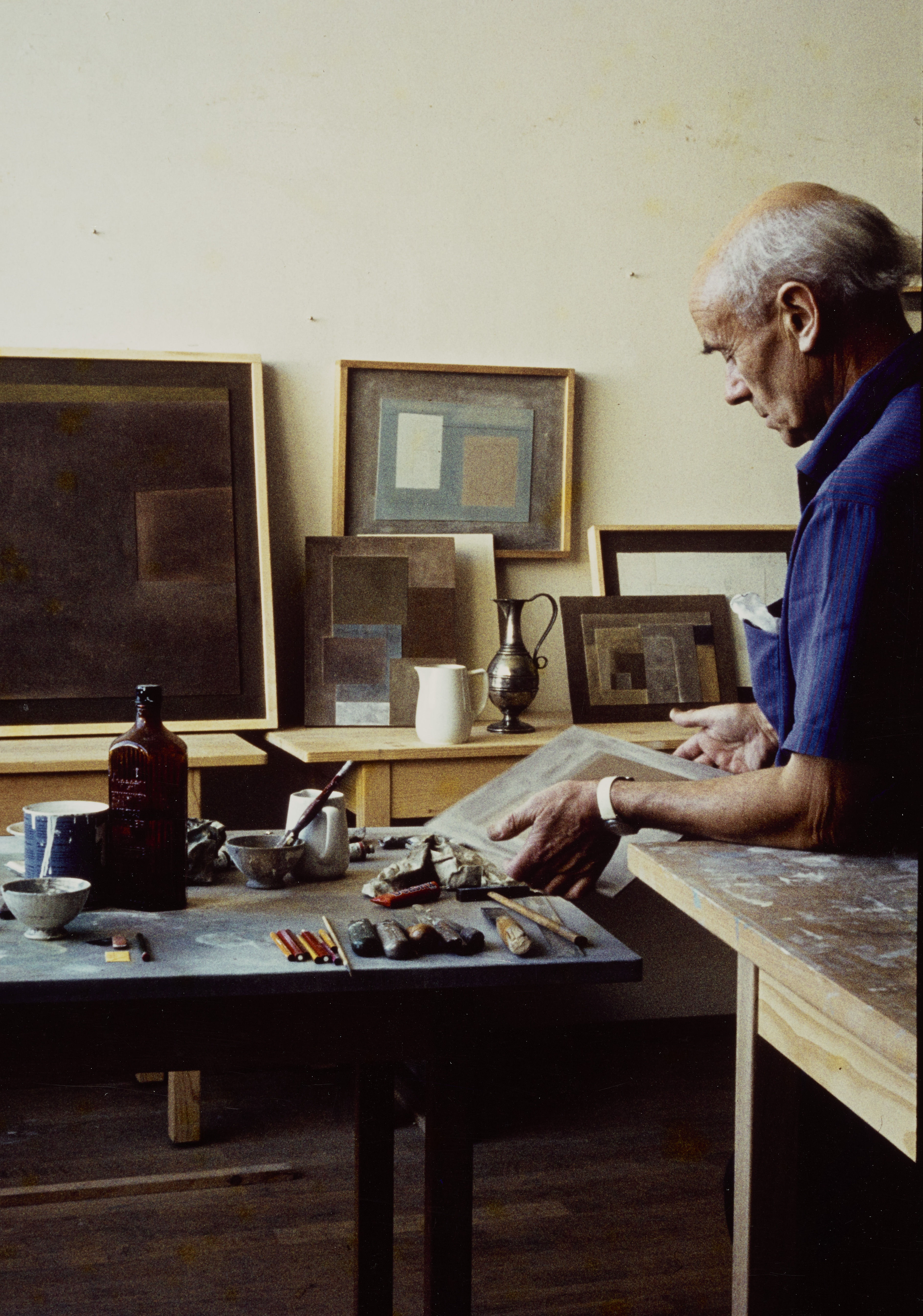 In all of the carved reliefs made between 1965 and 1971, curved forms frequently carry an association with Carnac. Works from this period were exhibited at Marlborough Fine Arts in 1971 and included amongst them was 1971 (two squares and very green). While the two eponymous squares in this work carry no obvious association, the underlying columnar rectangle is redolent of contemporaneous works which make titular reference to columns or standing stones. (A closely related work, 1971 (Carnac with green), uses the same composition of two squares over a rectangle.) As Norbert Lynton wrote in the accompanying catalogue, these reliefs ‘look sharper, tougher and more physically imposing’ than earlier work from Nicholson’s career. A photograph of 1964 shows the artist in his Swiss studio with the kind of heavy-duty equipment that he was using at the time. Awls, chisels, a razor blade and a small hammer lie on a table beside pencils, pots and a tube of Durofix glue.