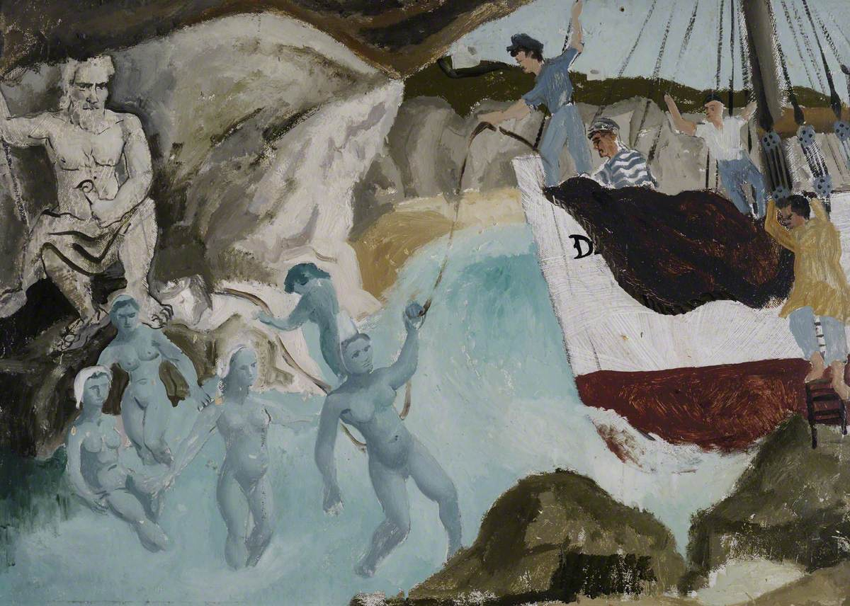 Though he had treated narrative figure subjects before, more amorphously classical and poetic subjects emerged in Philpot’s work of the 1930s, apparently as a complement to his new modernist idiom. Two Muses at the Tomb of the Poet, executed shortly before his death in 1937, co-exists in Philpot’s late mytho-modernist work with a motley cast of other Muses, mermaids, the Fates, St Sebastian, and many other blank-eyed, pensive, sallow-skinned gods and demigods. It was executed following a stay in the Riviera resort of La Trayas, the landscape of which appears in this work and related oils and watercolours from the visit. These impassive figures defy formal iconography, with Philpot instead using them to evoke a subtle atmosphere of melancholy and introspection. In his most engaging society portraits of this time, including Lady Gwendoline Cleaver and Lady Gwen Melchett among them, the sitter might be mistaken for one of these other-worldly mythic figures.