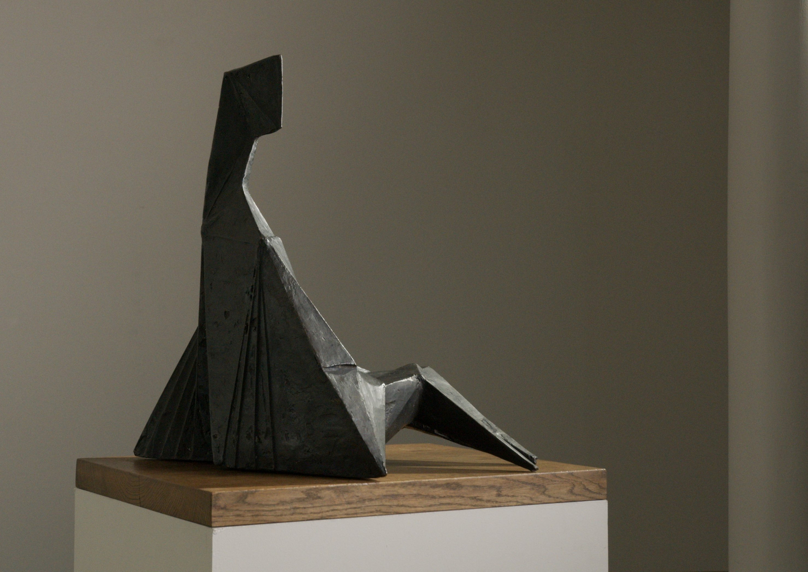 Every figural artist has to reconcile the human body with the constraints of their medium, compromising and coercing flesh and artistic fabric into a satisfactory relationship. In Chadwick’s case, a human presence was always implicit in his sculptures, even as the elementary composition of three- and four-sided planes provided the framework for representation. In Seated Figure I, as with much of his other work, the characteristically un-armed body is evoked using a succession of stepped and jointed planes: the back of the figure is forcefully composed from a jaw-like set of interlocking isosceles triangles, an elegant conception which speaks of metalwork rather than skin. Yet Chadwick’s figures are human, they have body language and character, and as the sculptor himself said, ‘they all have their own thing to say’.