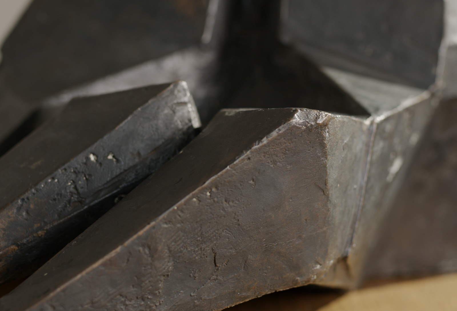 Writing of Chadwick’s work from the 1970s, his monographer Michael Bird has described how ‘[t]he male forms tend to be angular, […] made from steel and Stolit but recalling the hand-formed surfaces of ancient terracotta from Tanagra.’ Stolit, a cement made from plaster and iron filings, was an original choice of material – not previously used in sculpture – which Chadwick first adopted in the 1950s. The material helped him to achieve in his models a distinctive scabrous texture, applying the plaster over the figure’s basic steel armature to build up the desired shape and a continuous surface. The shape and rippling texture of the model was then transferred without deviation into a bronze cast.