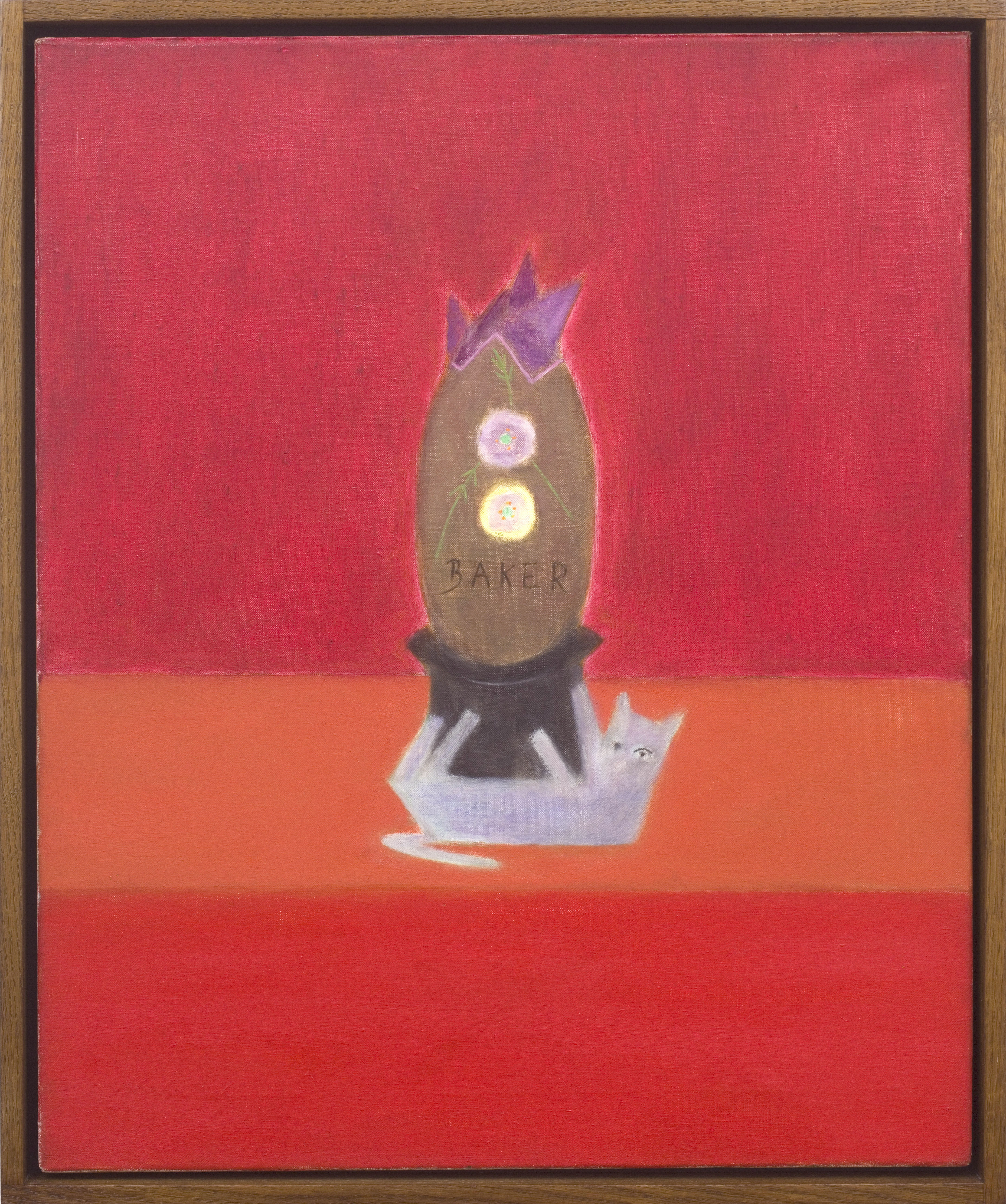 Writing in 1979, the critic John McEwen suggested that, ‘[i]n England one of the most notable exceptions to the general conformity is the work of Craigie Aitchison.’ From a painting like Baker’s Egg, it is clear what McEwen was talking about. The painting depicts an Easter egg balanced on top of a china ornament. Aitchison’s home in Lambeth was filled with similar trinkets, many purchased from charity shops or tourist kiosks abroad. The one in this painting is characteristically gauche: a pussy cat rolling on its back with a top hat on its belly. The work was made as a gift for Aitchison’s friend, Jonathan Robinson, whose nickname ‘Baker’ is inscribed on the egg.