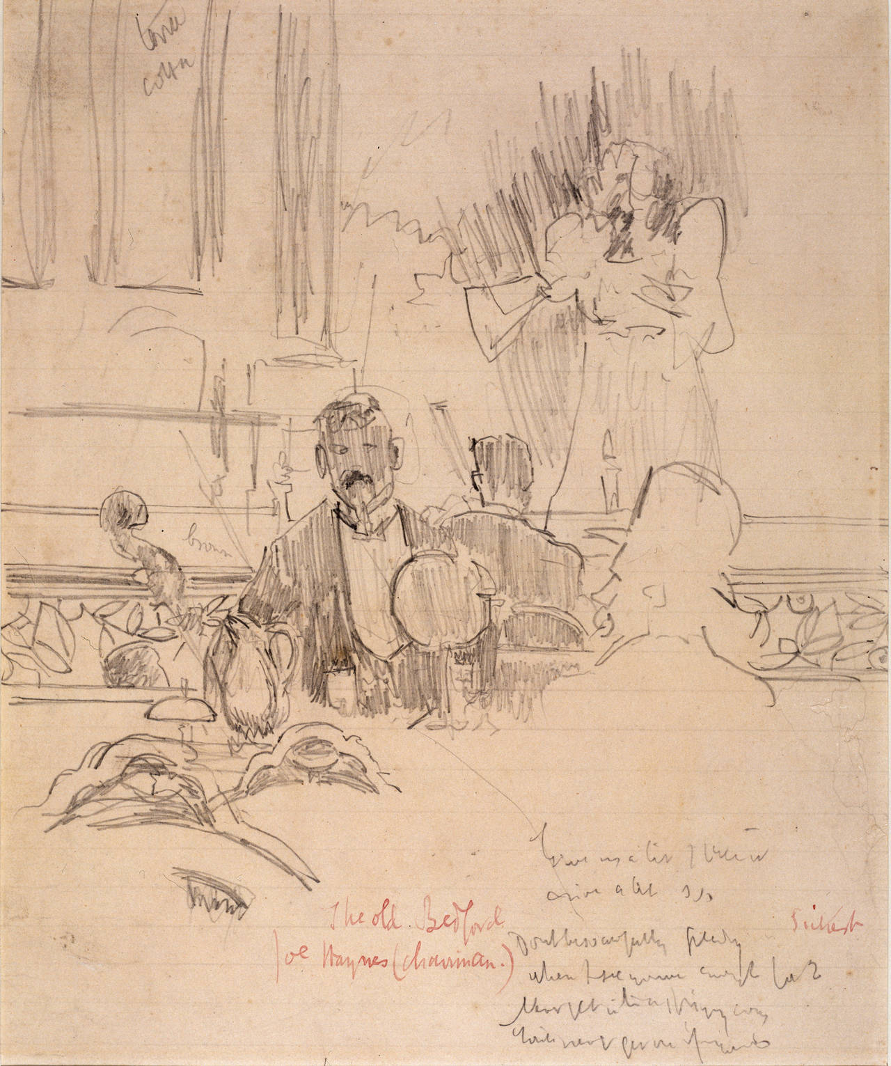 Despite Sickert's good intentions, Ethel Sands's dining room was eventually decorated by Duncan Grant and Vanessa Bell. It is unclear how advanced in Sickert's scheme the large paintings of The New Bedford were when he stopped working on them. These remarkable and evocative paintings are in parts very resolved, as in one of the plaster caryatid figures, while other areas are executed in cursory outlines. Their great size implies that they were the 'final' canvases, ready to be installed upon completion. However, it is most likely that Sickert never resolved within himself how to complete them. In any case, the paintings were never delivered. The signature at the lower left-hand corner of Piano Nobile's New Bedford is telling, however. To Sickert, this was a work worth releasing to the world and, more than a century on, it is easy to see why he thought so.