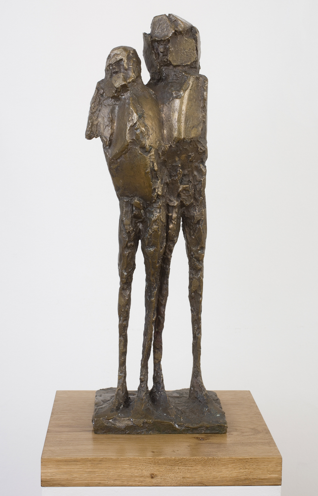 The auspicious beginnings to Frink’s career were underpinned by her original outlook. She developed a distinctive figure type, rich in zoomorphic ambiguities. Deriving from her signature ‘Bird’ sculptures of the early 1950s, much of her most recognisable work until the mid-1960s is characterised by extended spindly legs and contracted or reshaped limbs. In the later 1950s, Frink’s vision of flawed humanity found expression in her Birdman series, an early plaster prototype for which was recently donated to Leeds Art Gallery. This haunted figure is redolent of Giacometti’s work in both handling and mood, with the original addition of anthropomorphism. Works like Assassins sit in a direct formal lineage with Birdman, being wreathed in the same murky humanoid complexities.