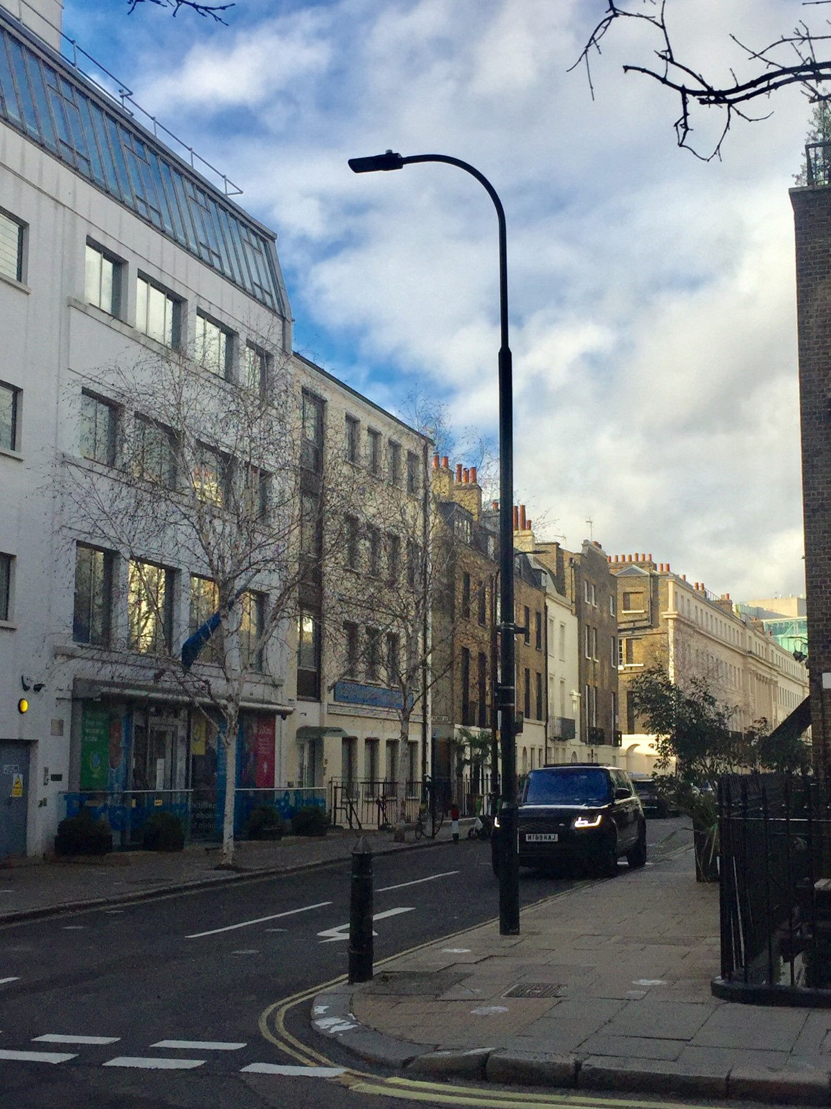 It follows that London Street Scene in Snow does in fact show a Fitzrovia street which Gilman overlooked while living in rooms at 47 Maple Street between 1914 and 1917. Beechey’s discovery is instructive as it proves not only that Gilman’s lodgings were on the first floor, as was long suspected, but also that London Street Scene in Snow must have been painted in early 1917 before the artist left Maple Street. By a quirk of urban planning, as Beechey’s photograph shows, a lamp post still stands in the same spot as that depicted in Gilman’s paintings.