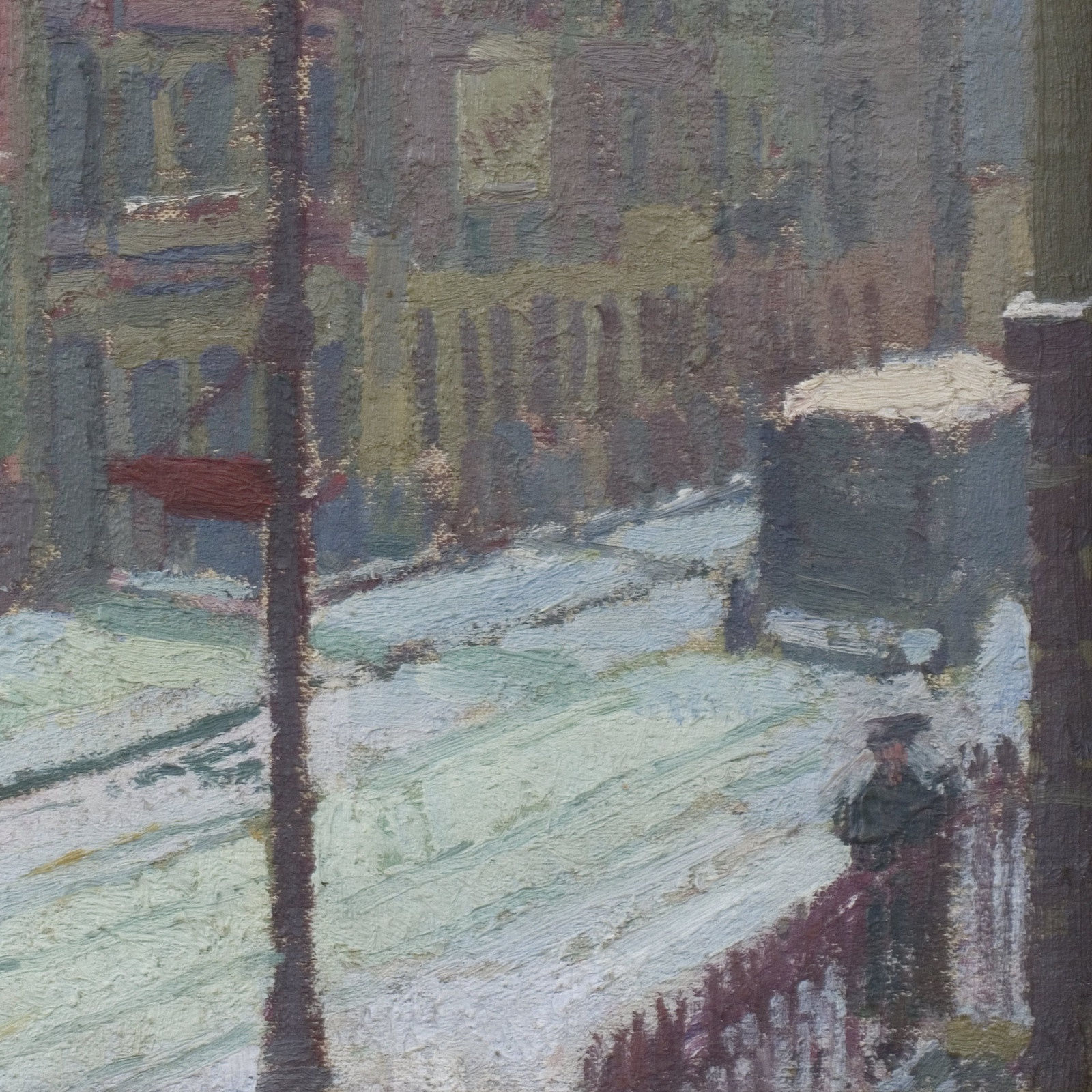 As Lisa Tickner has observed, the advent of modernism and the internal combustion engine were roughly coincident. As Sickert tellingly remarked, ‘if efficiency could be considered a fault, and incompetence alone sublime, […] Picassos and Matisses would be painted by all the coachmen that the rise of motor traffic has thrown out of employment’. A snow-covered wagon is viewed from the back, crunching its away along the street in Gilman’s snow scene. Whether it is motorised or horse-drawn is unclear. Many other tracks churn the surface of the painted road, its surface growing thinner – as if gouged by wheels – along the line of each one. In some places the coarse canvas grins through, a poignant contrast to the otherwise rich impasto finish.