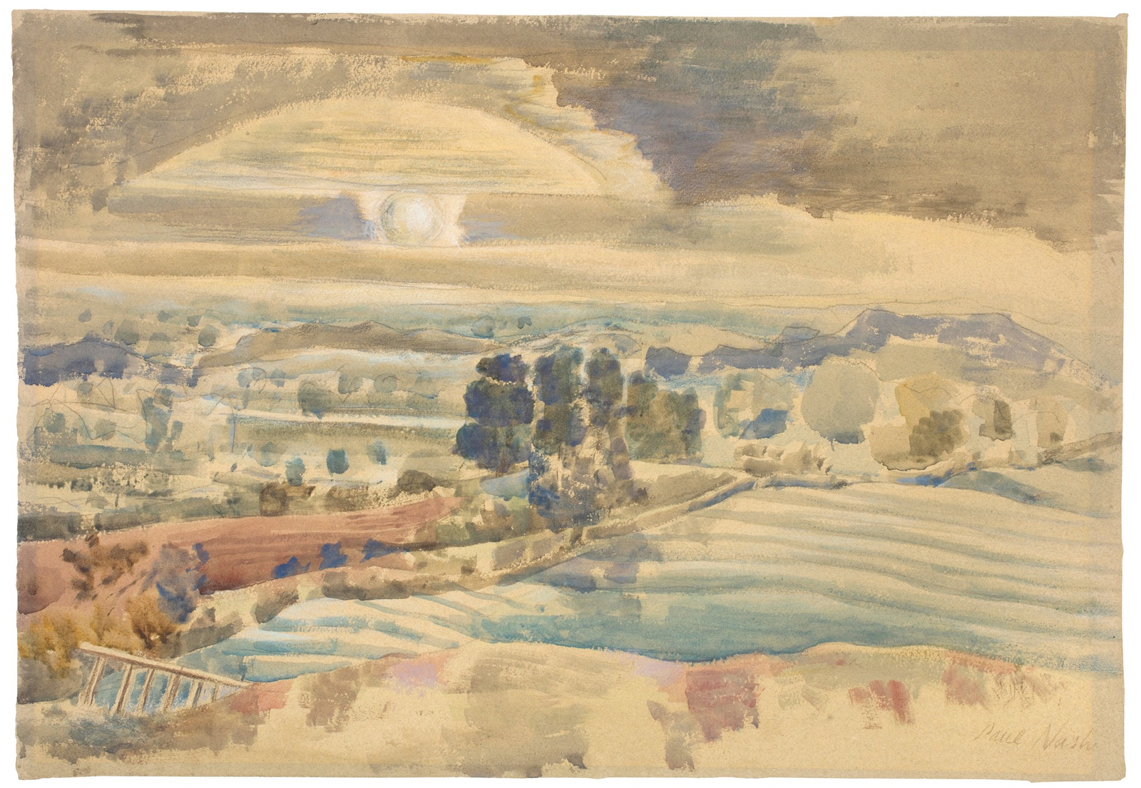 Nash's sensibility for shifting effects of light and shadow in a cloudscape was unmatched in his generation. The shape of a cloud affects how it reflects sunlight, and this interconnection of light and form is what makes the subject so challenging to depict. As clouds shift, so do the relative areas of light and shadow. In Sunrise over Valley, Nash observed and evinced these relations with an attractive sense of colour and design. To create a dazzling highlight in the sun's orb, grey-blue touches of a dry brush are placed to either side of it to heighten the contrast. The arc of light above the sun is at once naturalistic in its description of actual appearances, and weighted with poignance, as though a canopy had been erected to mark a momentous occasion.