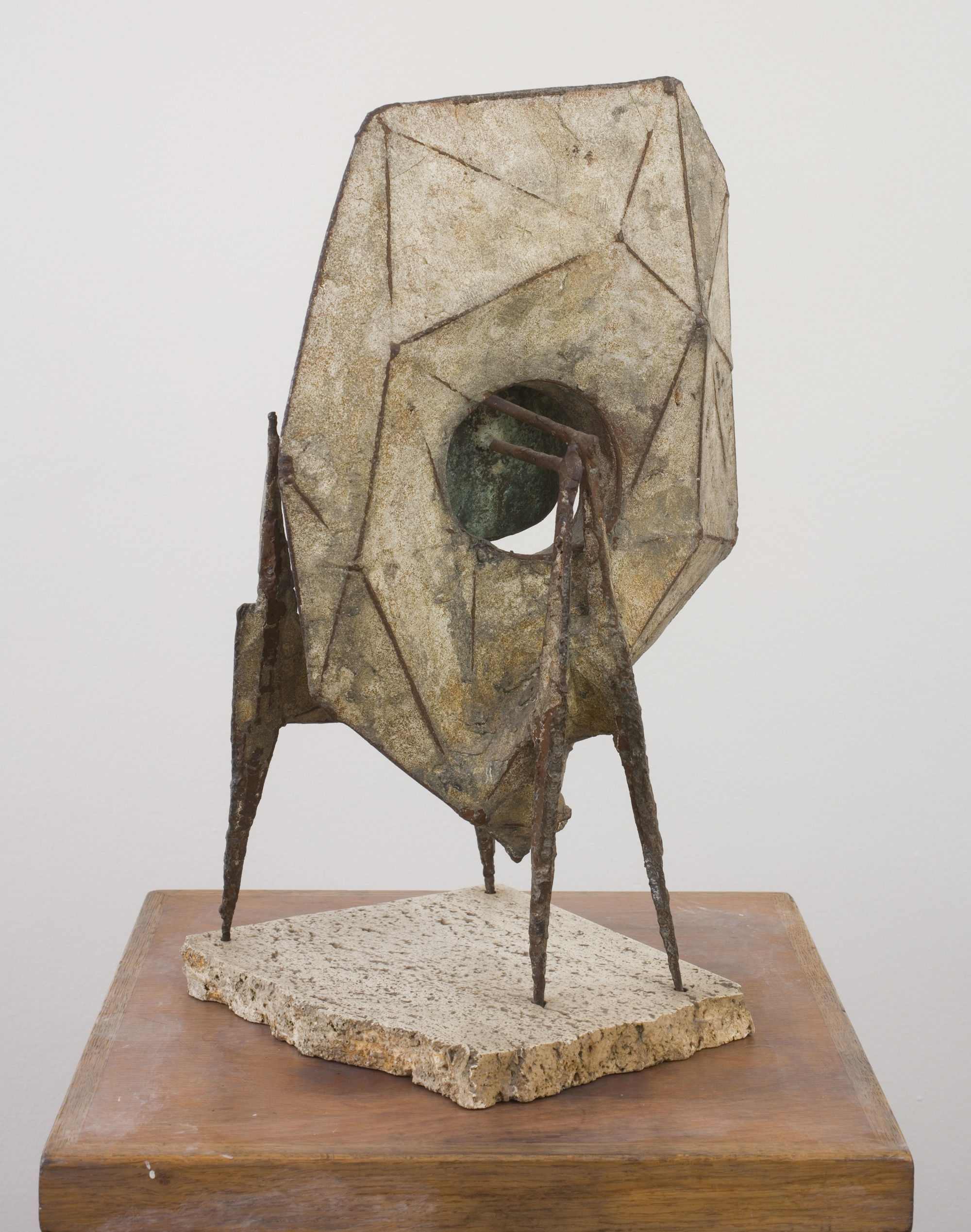 Although Iron Composition was not labelled as ‘idiomorphic’, it has the same ambivalence as other sculptures that were. It is a quadruped: four gnarled, pointed legs help it to stand up and leer forwards. The floating panel of copper is the focal point of the composition, an unseeing eye that stares. The irregular shaped panel behind the copper eye has the quality of a shell or a hide. The base is of porous stone and appears as some blasted piece of earth, closely similar to that trod by Reg Butler’s earlier Crouching Woman.
