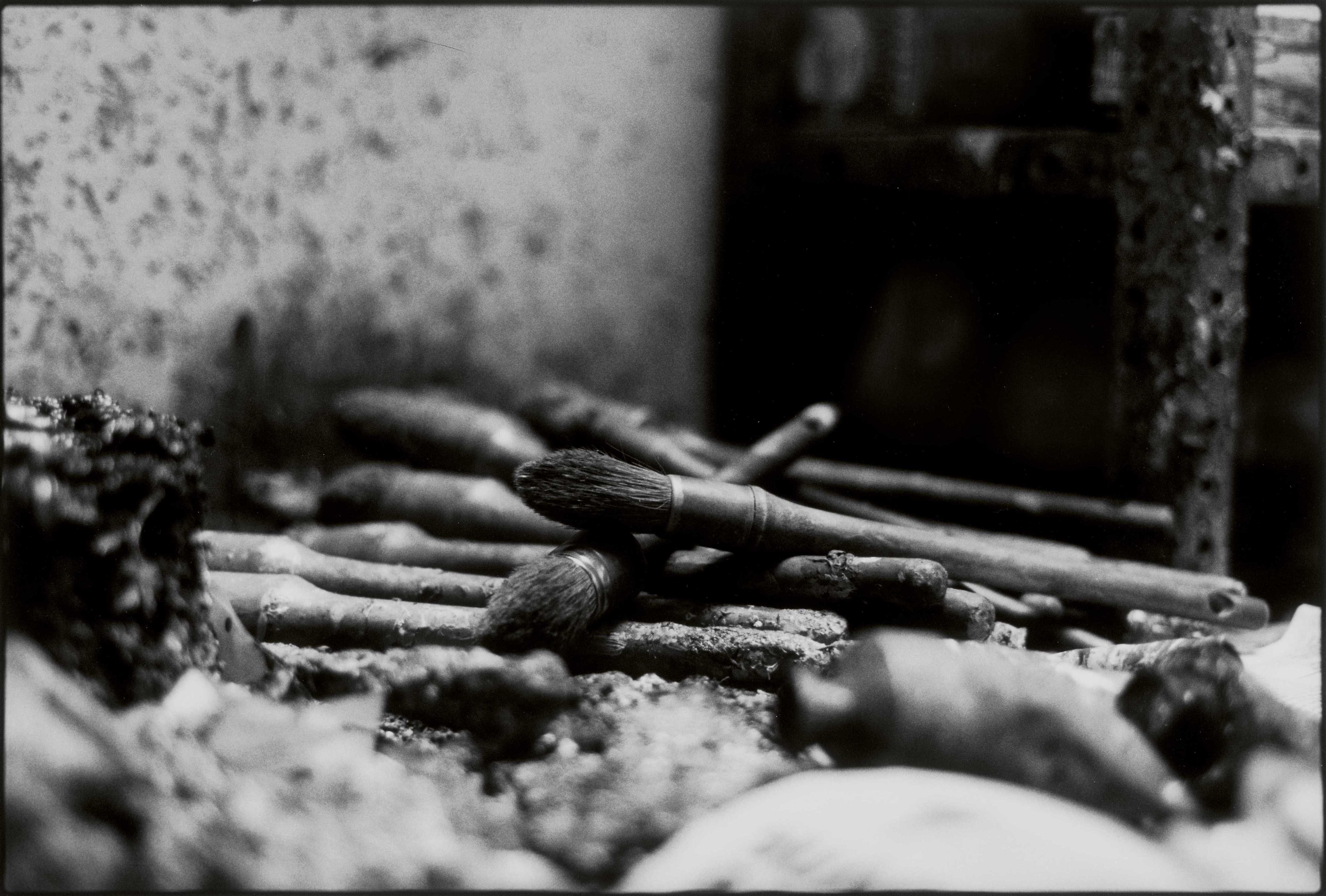 Bensley was not the first photographer that Auerbach has sat for in his studio. One of the earliest was Lord Snowdon who visited him on 10 April 1962. In the resulting photograph, later published in the seminal publication Private View (1965), the artist is wiping his hands with a rag, creating a blurry focal point at the centre of the image. The floor, his smock and his shoes are pitted with paint. Although the rest of the studio space is relatively clean and unspecked, the room is chaotic: an assembly of paint tins at Auerbach’s feet – manufactured by Stokes of Sheffield – is littered with more rags, a discarded teacup and a loosely furled, crook-handled umbrella.