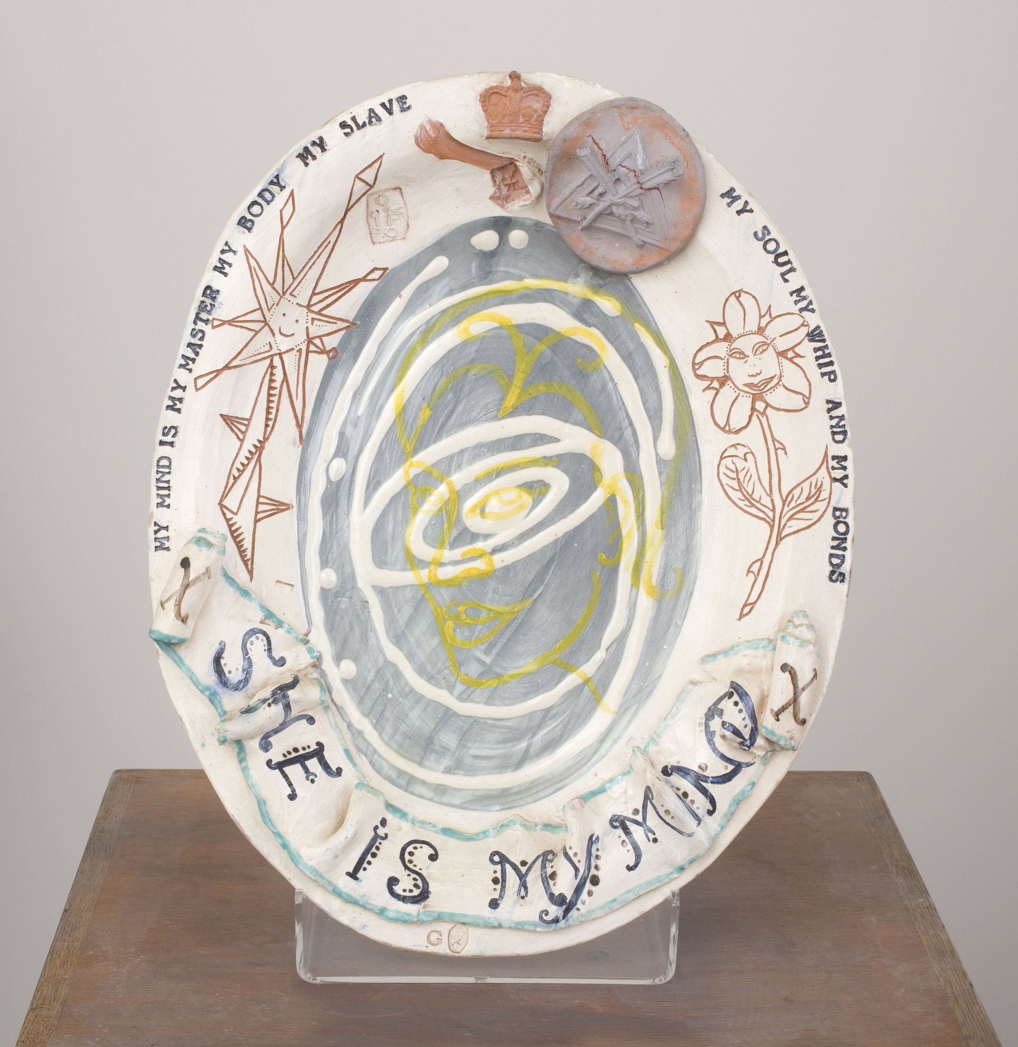 Perry’s ‘post-therapy’ work, made since the mid-1990s, has taken a more disinterestedly analytical approach to gender, identity politics and contemporary affairs. By contrast, Untitled (She Is My Mind) belonged to an unselfconsciously autobiographical phase of his career. At the time, his personal life was inseparable from the identities he projected in ceramic form. It is presumably one of Perry’s own interior voices who speaks the words ‘SHE IS MY MIND’, perhaps referring to his feminine alter ego Claire. A portrait of the elusive ‘SHE’ is drawn in a yellow glaze at the centre of the dish, her features generic and partially lost to underlying concentric circles of opaque white glaze. The variety of Perry’s interior voices is hinted to with the use of different fonts: where writing at the upper edge of the plate is fastidiously regulated with hand-impressed type, the phrase ‘SHE IS MY MIND’ is hand-written in a scrolling, dot-decorated glaze.