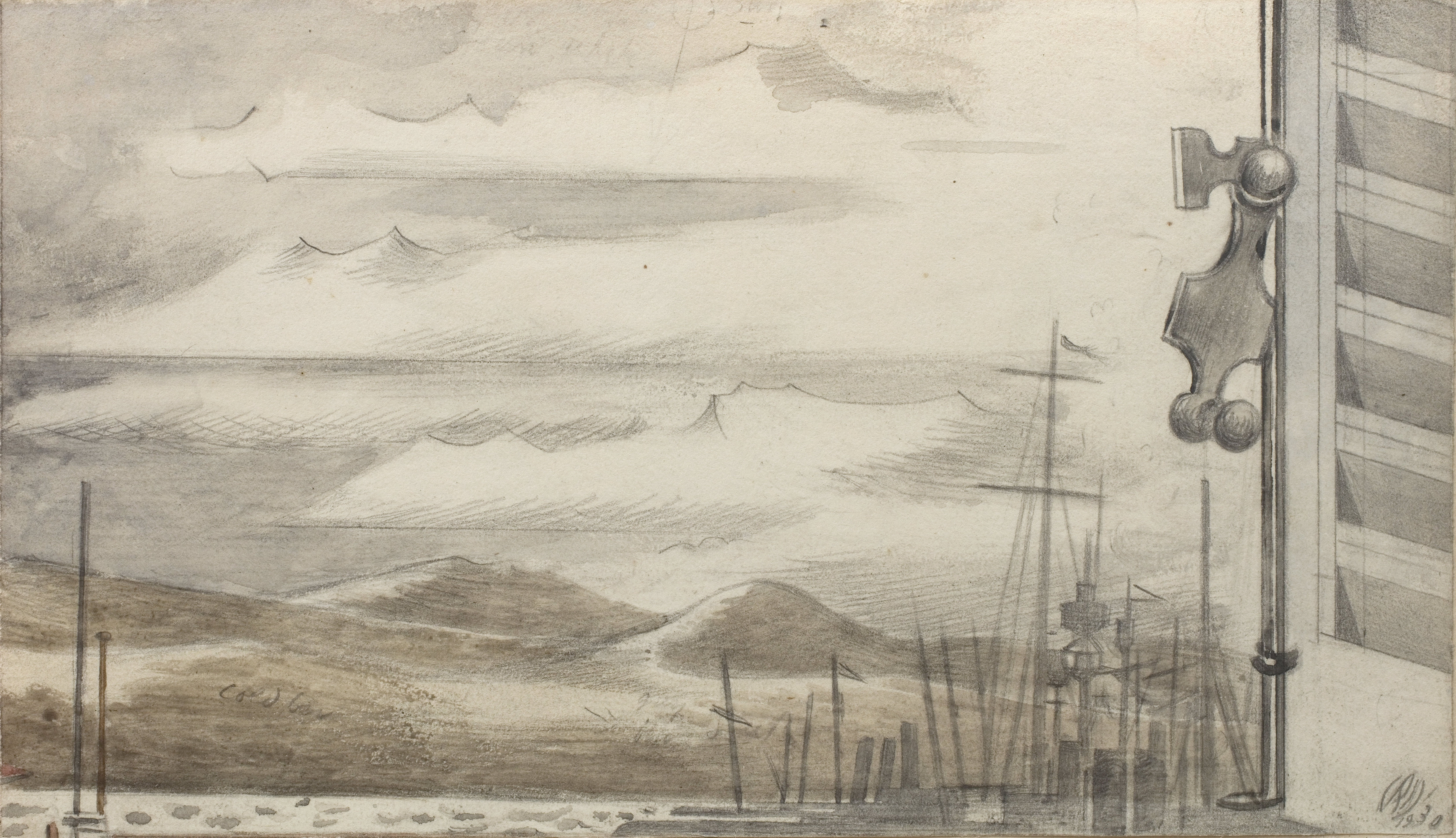This ‘very beautiful picture’, perhaps the high point of Nash’s engagement with surrealism, was the product of long and careful study. Causey records the existence of eight sheets from a sketchbook used by the artist in Toulon. These studies are mostly squared for transfer, and the watercolour Harbour and Room is underpinned by a pencil-drawn latticework of vertical, horizontal and diagonal lines, which allowed the transposition of various components into a single coherent space. In Harbour and Room and many other pictures by Nash, this kind of sound technique and craftsmanship intersects with a numinous poetic vision. The result is a profound art that resonates with the timbre of its period.