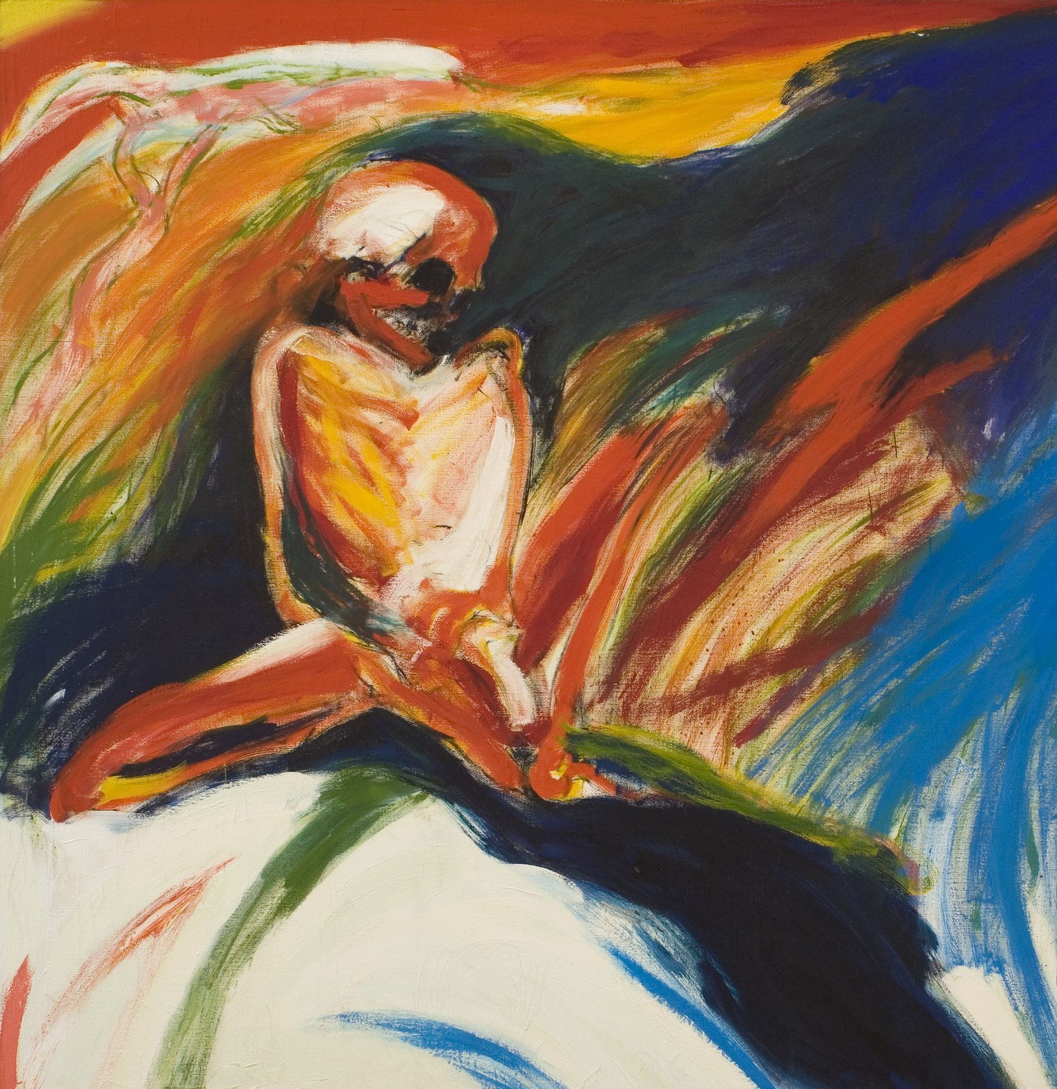 Figure in Landscape depicts an animated skeleton figure ensconced in a landscape of ambiguous proportions. A lightning bolt of red rainbow slices downward across a cloud of ultramarine blue at the upper right-hand corner, a rippling motion answered all over the painting by similar arcing shapes – not least in the pulled back knees of the figure, which shimmer and bleed into the surroundings. A darkened, ink-like stream issues from the figure, trickling downward from left to right. Areas of opaque colour – a narrow strip of yellow at the right-hand edge, strokes of red and green at the lower edge – are contrasted with thin, dry sweeps of the brush. Colour seems to be conditioned by the rainbow optics of dispersion, with each colour registering distinctly and in sharp contrast to neighbouring areas. Although the palette is wild and exaggerated, the painting is underpinned by the naturalistic shape of clouds, hills and streams. A tree at the upper left-hand corner is depicted with a fine outline in green paint, but there are no place-specific landscape markers: the fulgent colouring and amorphous terrain are sustained by the agonised skeletal figure and belong to it, either sharing its emaciated state of existence or helping to draw out the poison that afflicts it. As in the landscapes of Chaïm Soutine, emotions quiver in a zone beyond the reach of language.