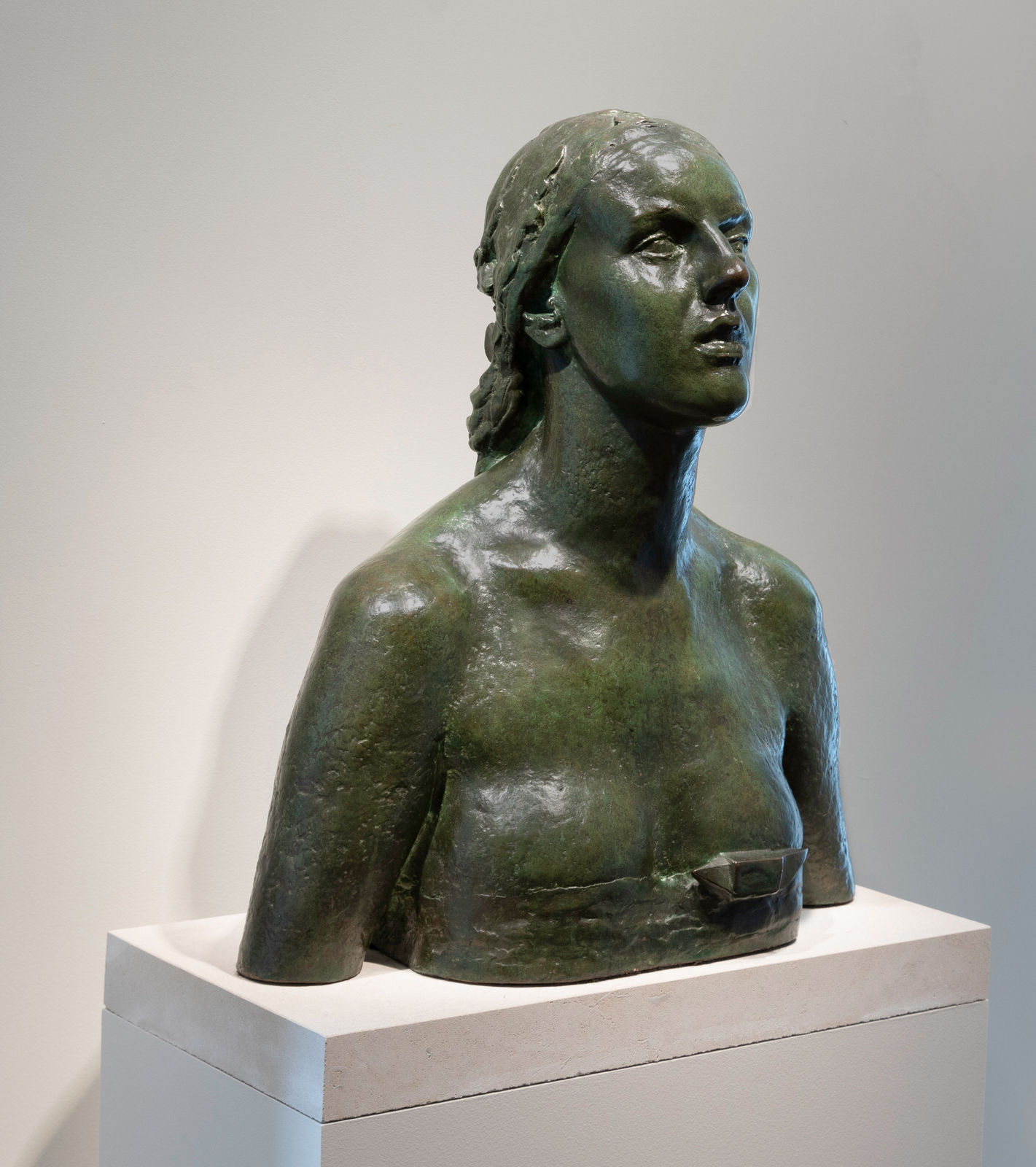 Epstein’s ‘second portrait’ of Lamb adapts the classical format of the portrait bust. The flat bottom of the bronze, shorn of the moulded plinth used in so many traditional busts, gives a sense of Epstein’s artistic projectile—moving away from conventional forms of working towards a more transgressive practice. The sensual quality of the sitter’s body is communicated: it is cropped to include the beginnings of her arms and her breasts, the latter partially concealed behind a strapless slip, adorned with a protruding angular bow. The modelling and detailing are naturalistic and vital, and the line of her shoulders and the curve of her back suggest a sense of Lamb’s posture. To treat a named sitter with such freedom was unusual. It suggests the complicity of the model and the artist—Lamb being indifferent towards social propriety on one hand, and Epstein pursuing his own distinctive artistic and erotic purposes on the other.