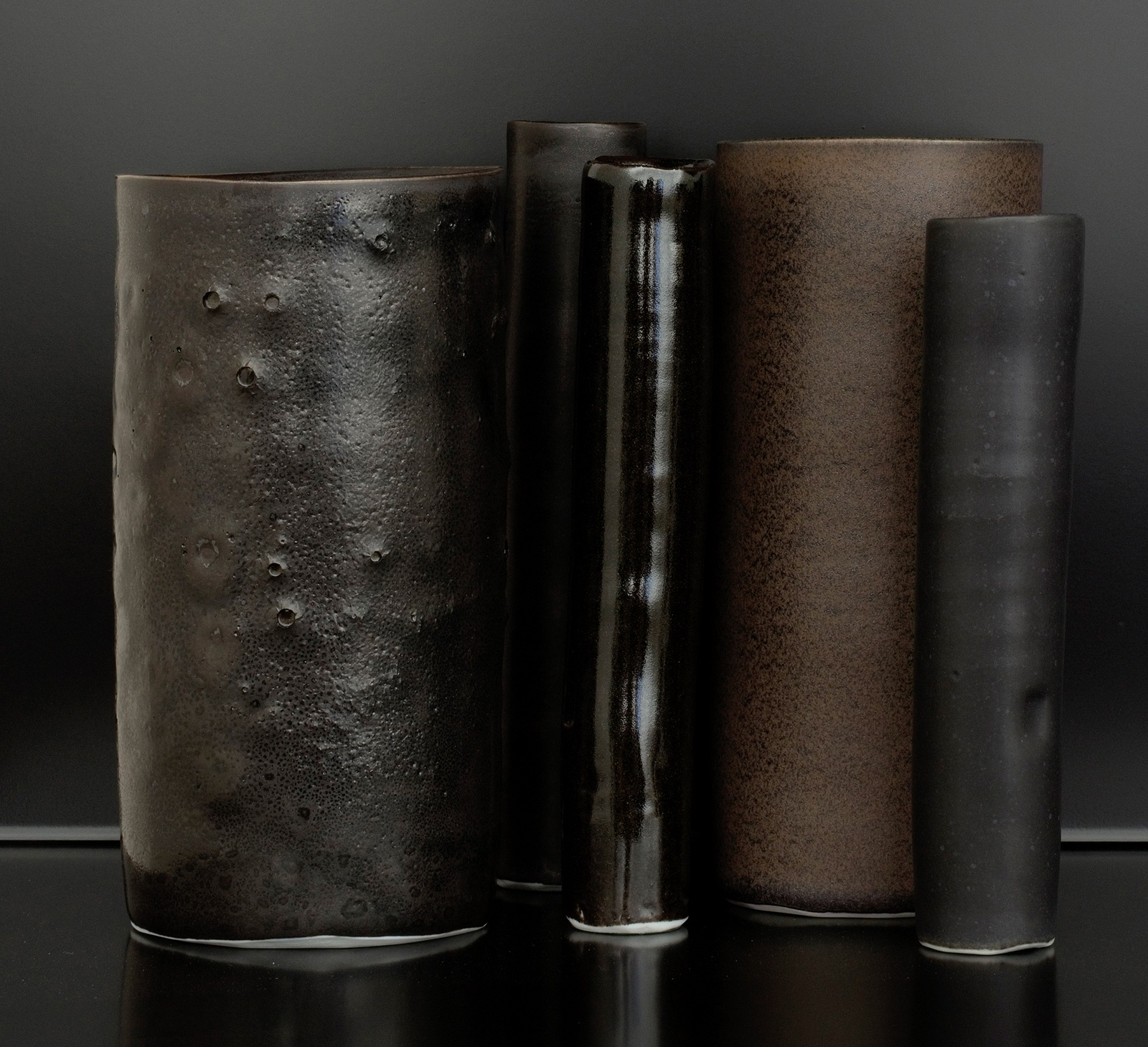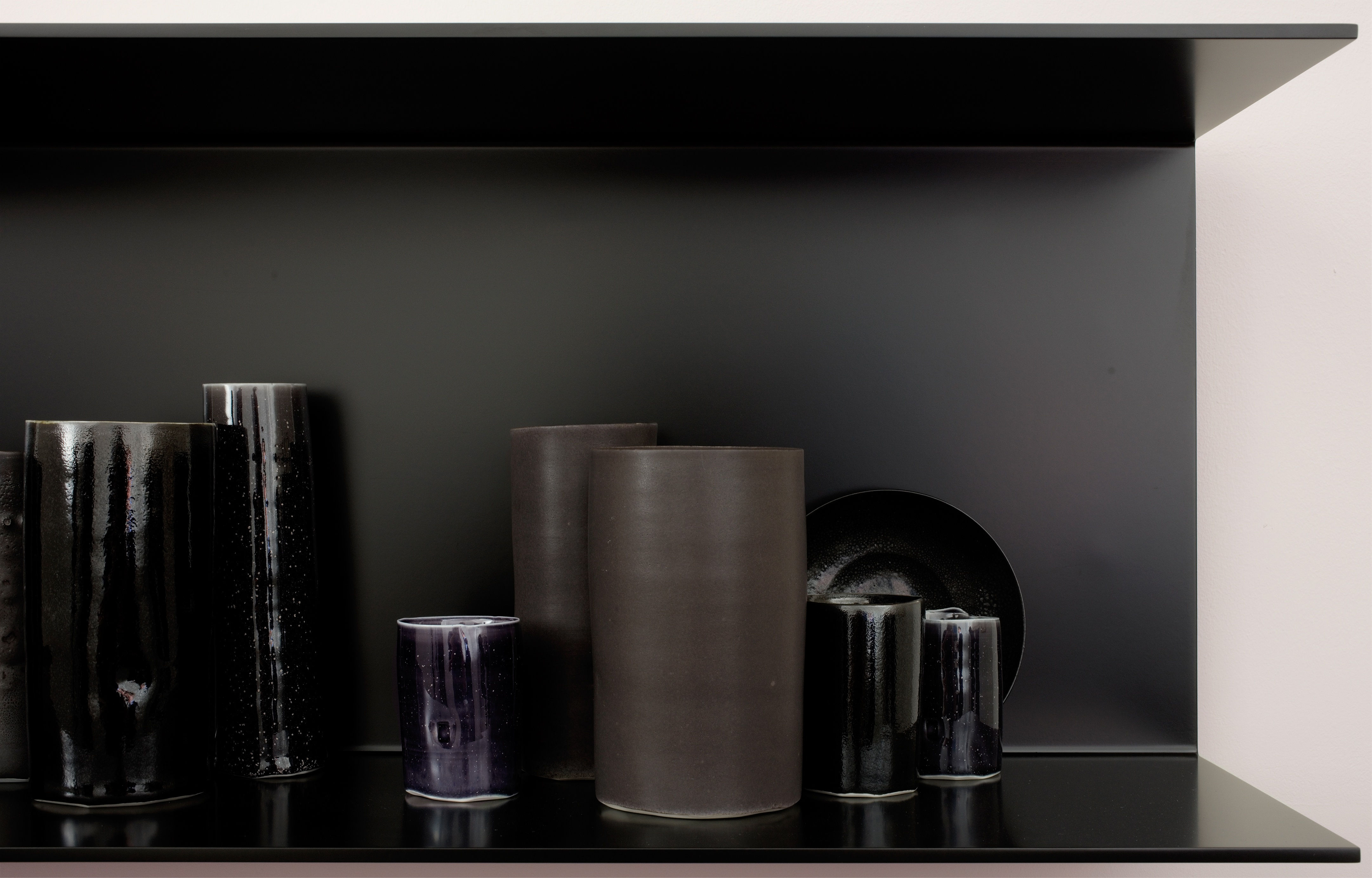 The formal clarity of de Waal’s work—white vessels in white cabinets, black vessels on open-sided shelves of black aluminium—contains an abundance of reference, allusion and metaphor. He began making frequent use of black-hued porcelain clay around 2012 and works of this kind have a superficial affinity with Leach’s idiom of oil-spot glazed stoneware, which was in turn a response to ‘blackware’ manufactured in medieval China during the Tang and Song dynasties. (Leach himself acknowledged this stylistic allegiance, baldly identifying ‘the qualities of the T’ang and Sung dynasties as the height of ceramic beauty’.) In a concise historical overview of ceramics, The Pot Book(2011), de Waal gave sympathetic accounts of both Leach and Song dynasty stoneware, referring to the latter ‘glistening like the night sky’.