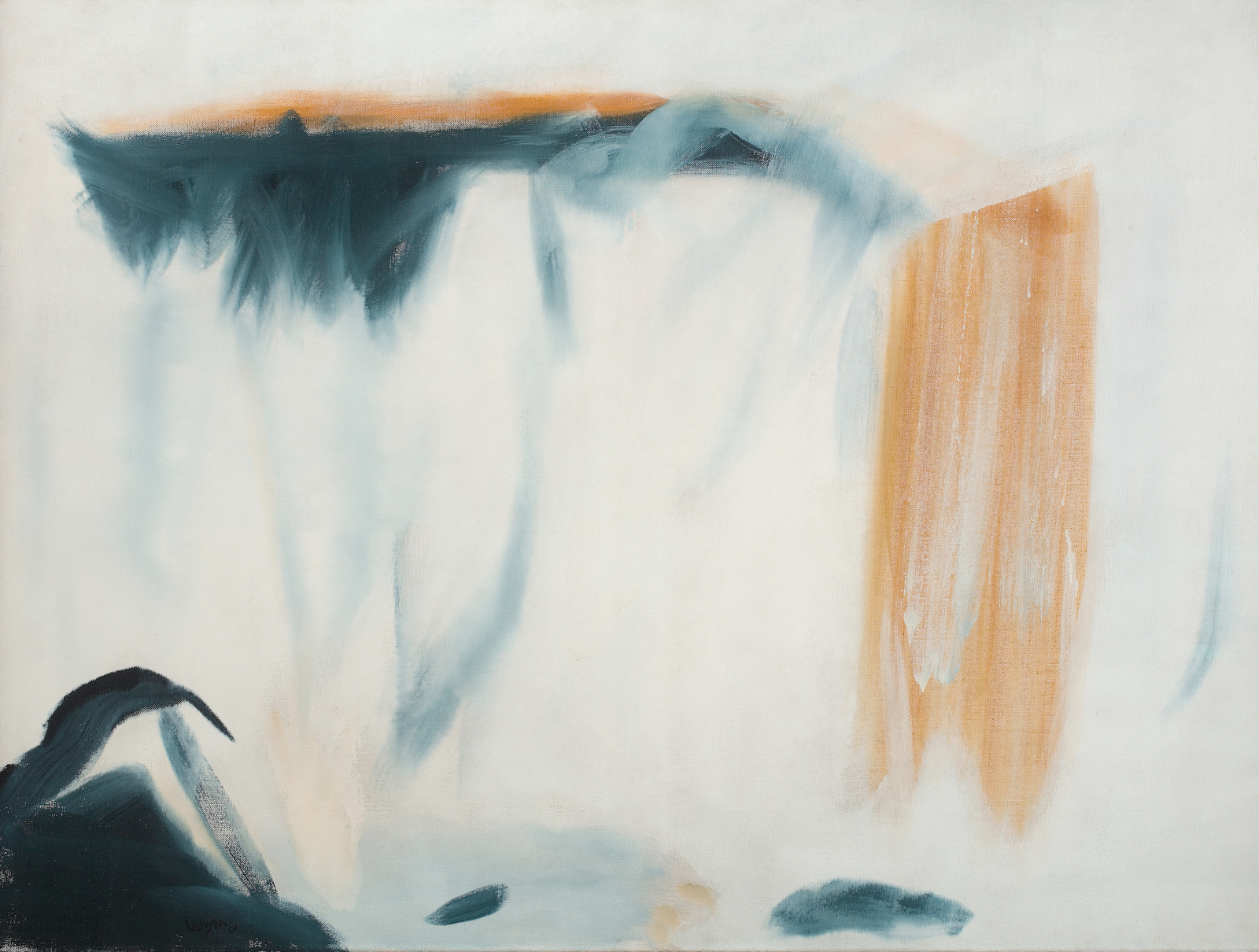 In aeronautics, the phrase ‘still air’ means there is no wind and no vertical air motion. Lanyon’s painting of that title is uniquely tranquil amongst the gliding paintings, and a mist-like skin of white paint variously overlays and entwines wet-on-wet with contrastingly vibrant channels and islands of muted orange and navy blue. The surface and underlayers were both painted thinly, such that subtle variations of colour in the underlayer are vividly apparent at the surface. Lanyon often worked on such paintings during intense bursts of activity, and the range of his painterly idiom is well represented by Still Air and Airscape, both of which—as indicated by the artist’s inscriptions to the reverse of each canvas—were completed in September 1961. Lanyon also used significant quantities of undiluted white paint in Airscape, but here the paint quality is tangibly thicker and the handling more gestural. Crisp sweeps of a loaded brush and wet-on-wet passages suggest a frothing, dynamic system of activity in contrast to the static one in Still Air. Such a range of invention was suggested to Lanyon by land and sky, and the idiom he devised was knowingly responsive to changes in the weather.