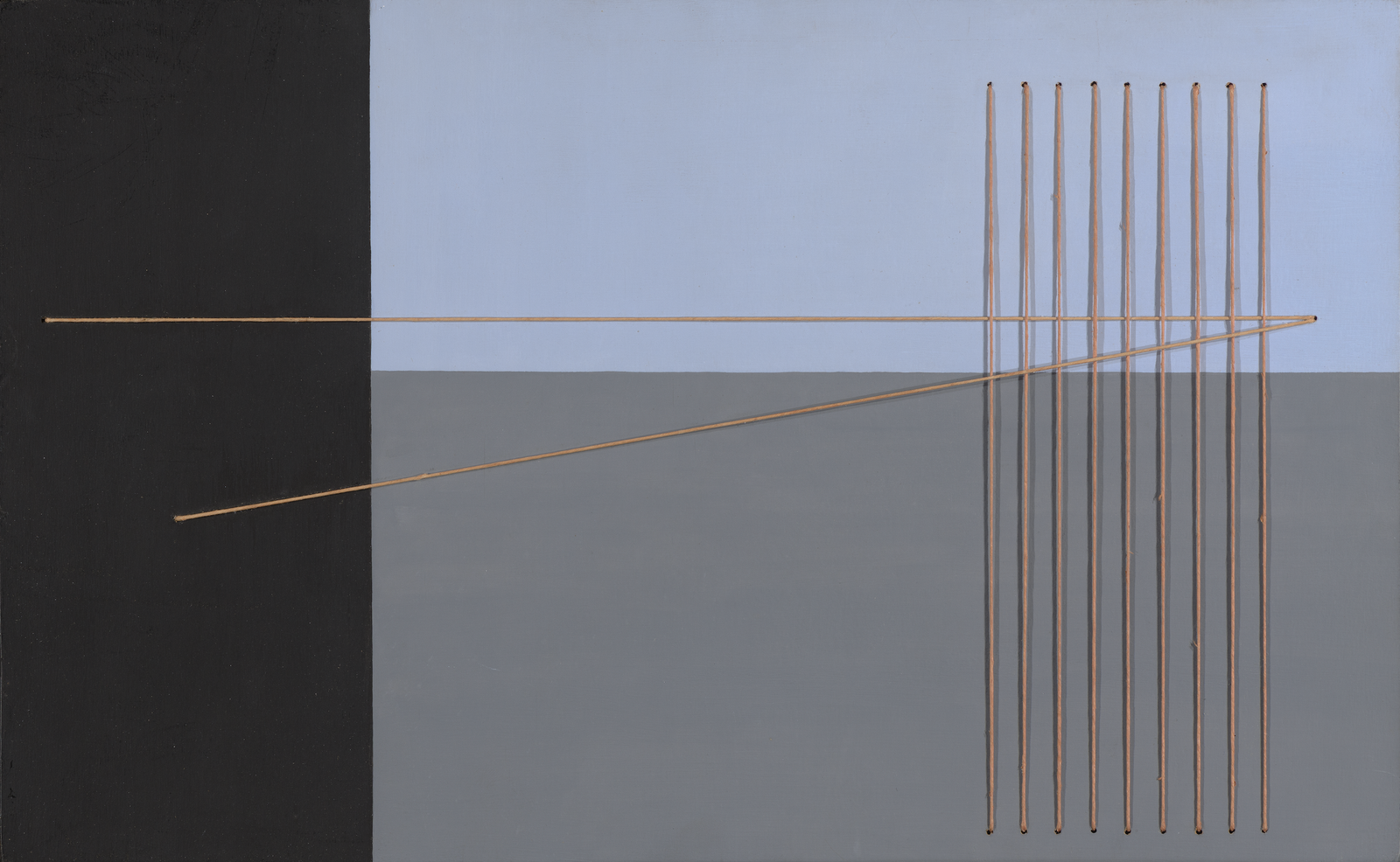 Shortly after Hepworth first began to thread string through sculpture in 1939, she also began to apply string and string-like motifs in her paintings and drawings. In two small, experimental works of 1940, she threaded twined string through holes in the surface of a planar abstract painting. The polarised, geometric units of colour are similar to those that her husband Ben Nicholson was using at the time, while the application of string emerged from her temporarily arrested sculptural practice. Whilst living in a small house called Dunluce in Carbis Bay between December 1939 and July 1942, Hepworth was unable to carve—she had no studio, few materials and little time or energy. She spent her days running a modest nursery for her children and others, as well as cultivating a small holding for sustenance. Throughout this severely challenging episode she produced some of her most lucid, cerebral abstract drawings.