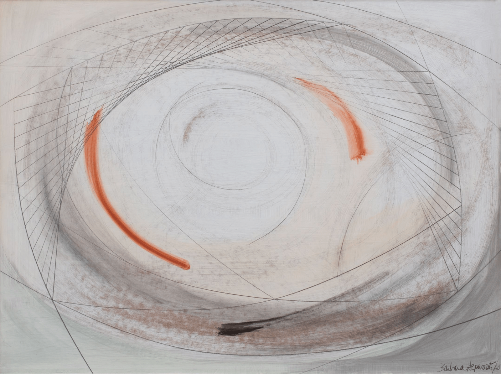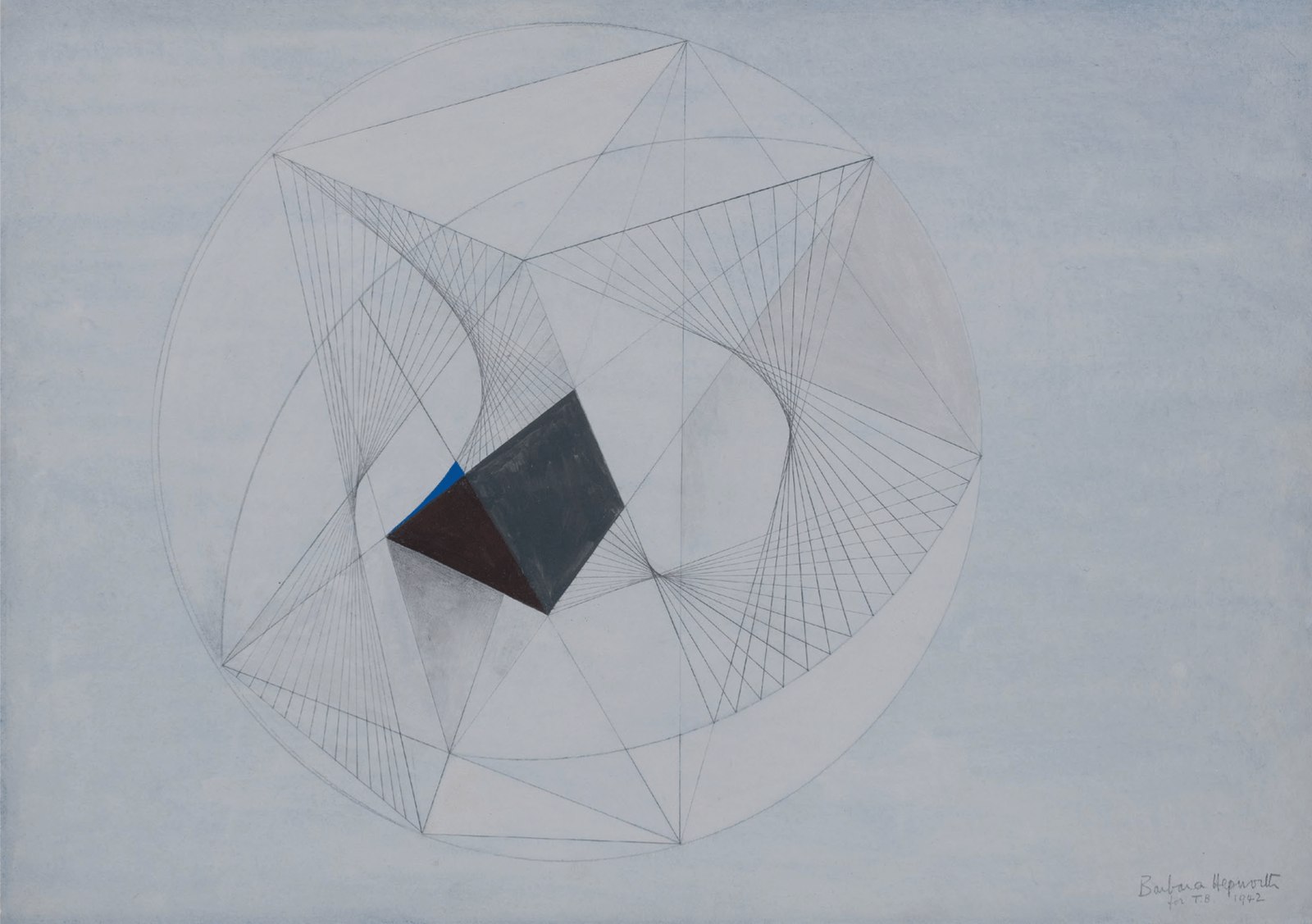 In a letter of April 1942, Hepworth told her friend Herbert Read: ‘I have a vivid dramatic wrestle with the clock every day—trying to wrest for myself time for thought and making things other than puddings.’ She later remembered how the drawings of 1940–42 were made ‘in the late evenings, and during the night’. Although they do not translate directly into three-dimensional forms, each drawing produces a multifaceted geometric body with qualities of volume and constellations of intersecting planes. The motif of spiralling strings was also prominent. Just like Hepworth’s stringed sculptures, her paintings and drawings used ‘strings’ to create a twisting plane that dissolves into a sinuous, transparent screen. Hepworth later returned to the spiralling motif in abstract paintings of the fifties and early sixties, in which pencil drawing counterpoints with painterly grounds of scumbled warm and cool colours.