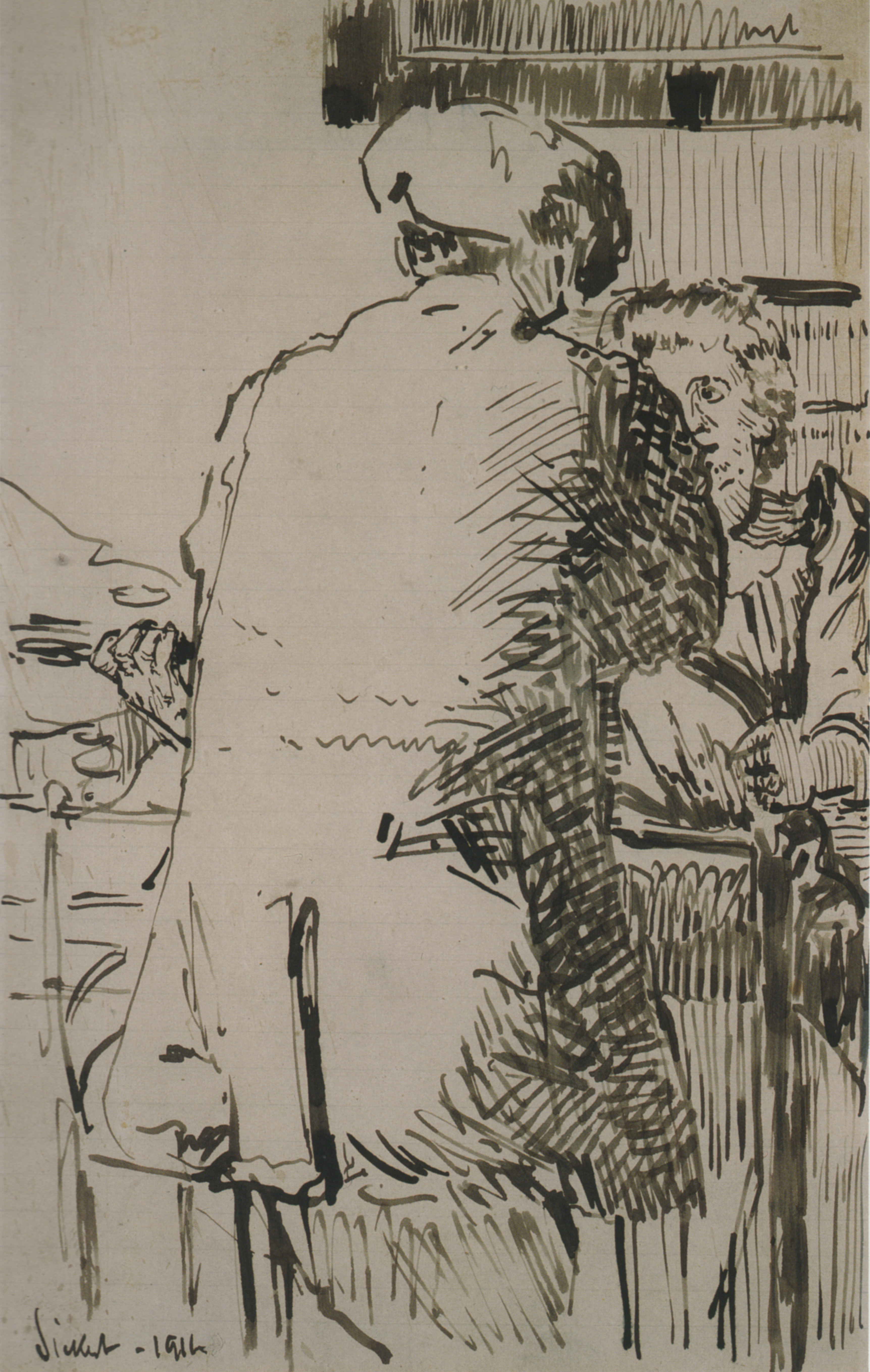 In drawings for reproduction made between 1911 and 1914, Sickert used his pen to great and varied effect. Shading was produced by hatching scratched in with short strokes and little ink, or elaborated in systems of dense, richly inked lines. In areas of crosshatching, competing systems of lines entwine and overlap to describe both shadows and the shape of the forms. Details—of faces, clothing, furniture—are evoked by perfunctory accents, often dashed or dotted. Silhouettes are seldom drawn in continuous outlines but rather intimated by the relation of light and dark areas, the frontiers of which are precise yet insubstantial. As with Sickert’s paintings and prints, so too in his drawings, modelling often cuts across the forms rather than flowing along them.