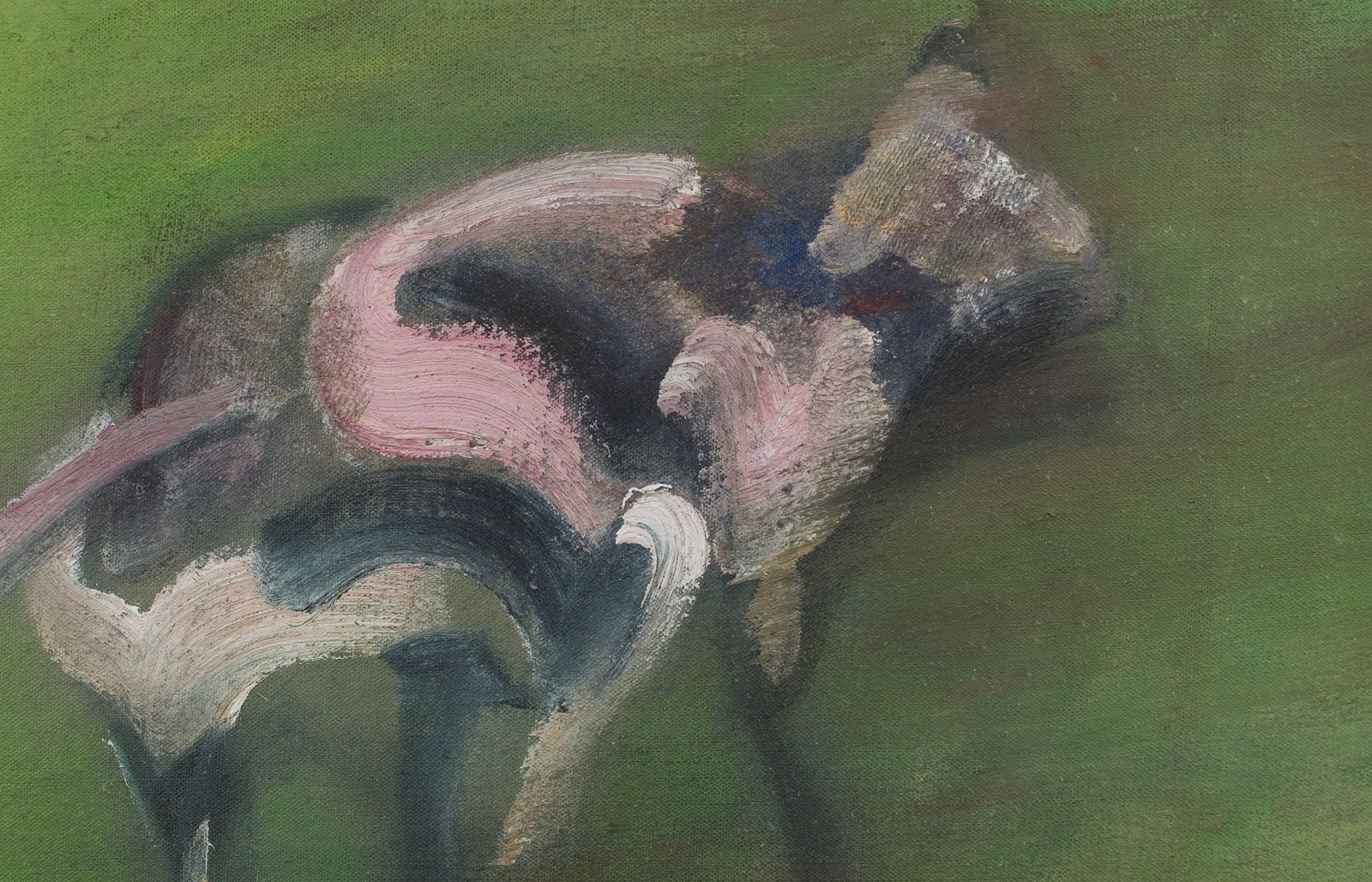 The imagery of Dog, a painting made in the late sixties, was taken from a contact negative made by the photographer Peter Beard. The art historian Rebecca Daniels first made the connection in an essay of 2009. The source image shows a trotting boxer, heading away from the camera, with a muskrat hanging from its mouth. Photography revealed the process of locomotion by which quadrupeds and other animals move, and by adopting the image of an animal arrested mid-step Bacon’s painting conveys a sense of movement passed and movement yet to come. The image is created from gestural and disconnected applications of paint, yet it is layered and contains the sense of a living, breathing, moving animal, as well as the sense of the photographic source object—blurred, tarnished, incomplete.