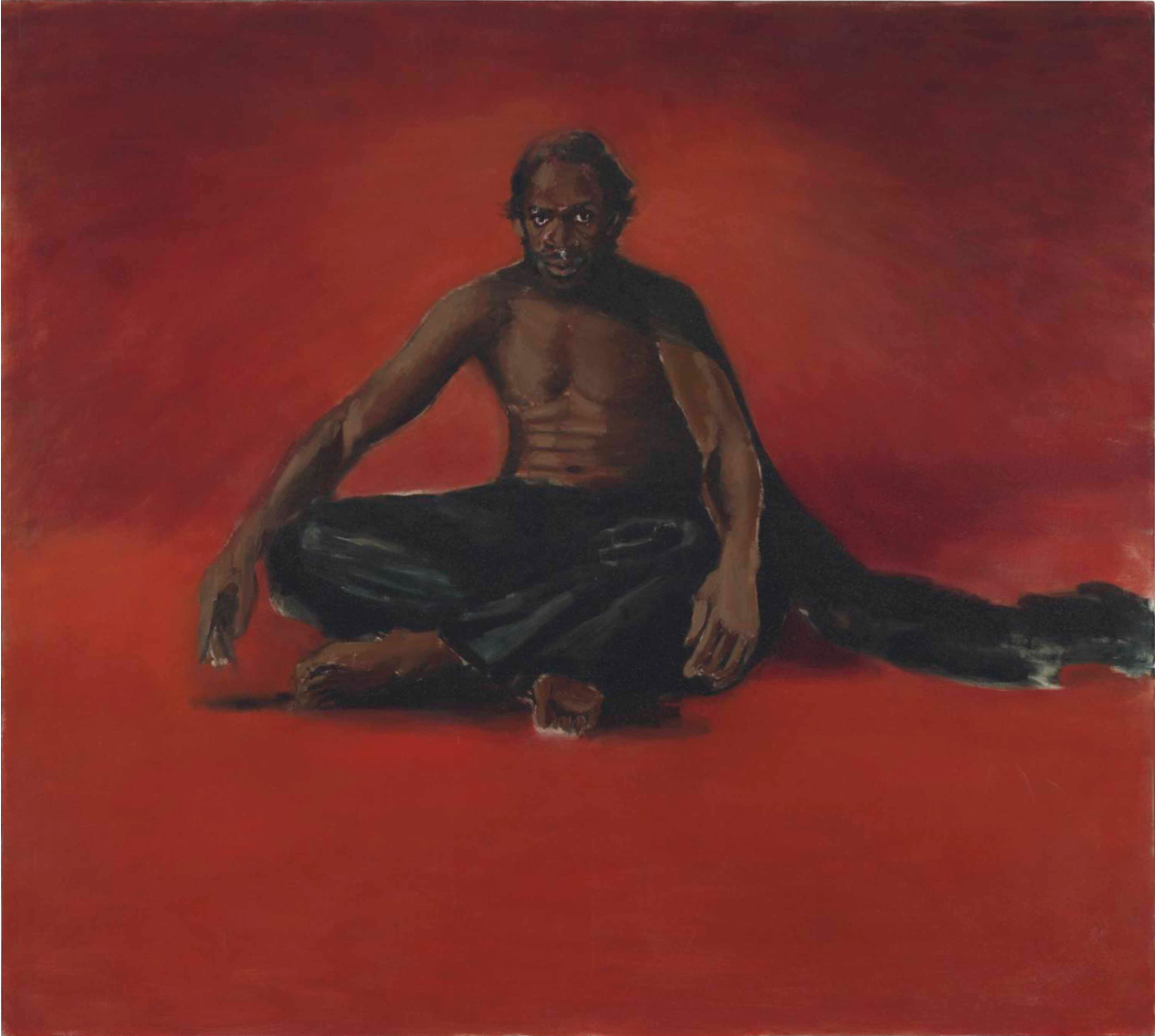 In Yiadom-Boakye’s painting Rose Nether Poetry, the figure is larger than life. Like all others in the artist’s work it is consciously shorn of contemporary features that might one day cause the painting to age prematurely. (She has previously remarked that for this reason she does not paint shoes; her figures either wear socks or bare feet.) Yiadom-Boakye is also a writer of verse and prose fiction, and her exhibitions and paintings bear literary titles such as To Improvise A Mountain and No Patience To Speak Of. Her titles seldom deliver an obvious description or interpretation of the images to which they pertain. But the elusive relationship between title and image reflects the private, uncommunicable creative zone from which Yiadom-Boakye’s paintings emerge. Like Piero’s St Michael or Fragonard’s figures de fantaisie, her people exist but not amongst flesh-and-blood mortals. They are paintings rich with the characteristics of ardent, engaged human beings.